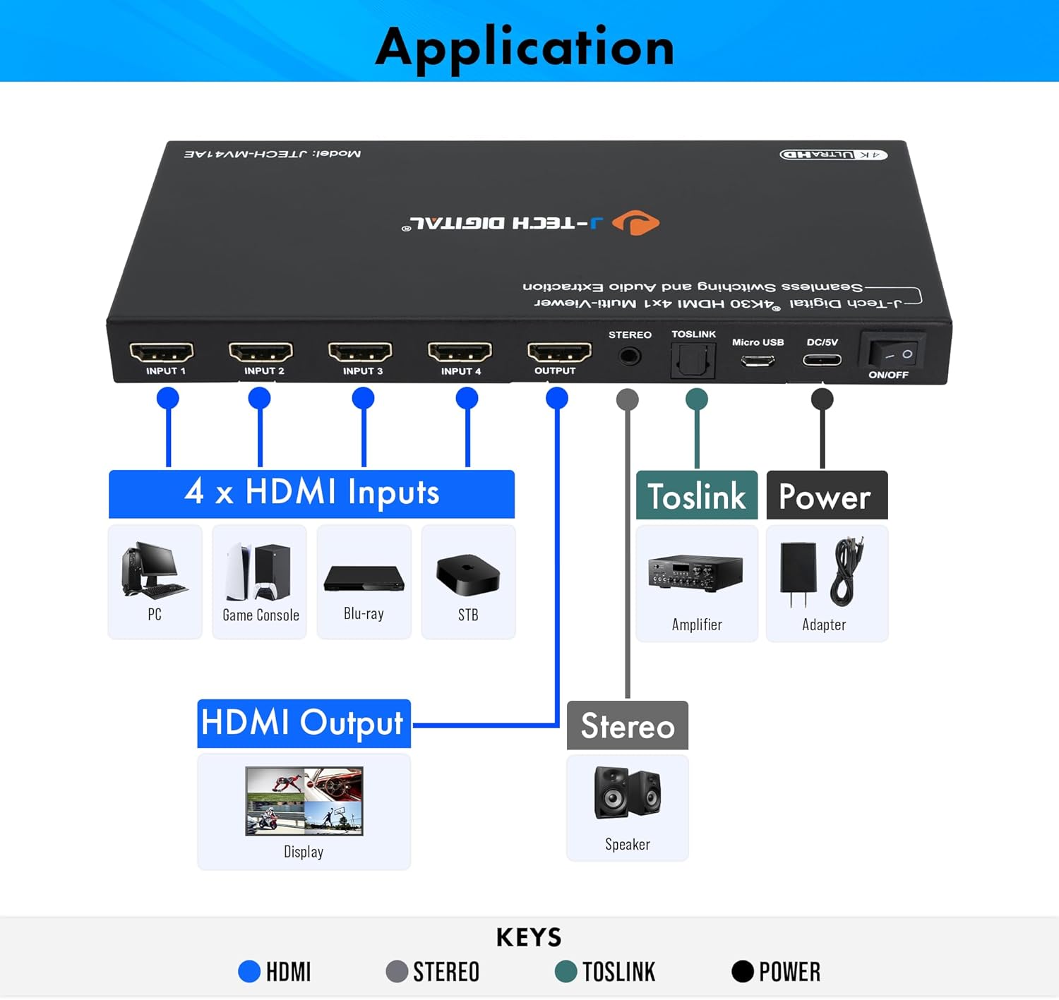 J-Tech Digital 4K HDMI Multiviewer Switch 4 in 1 Out, 4x1 4K 30Hz HDMI Quad Multiviewer Seamless Switcher with PiP, 6 Viewing Modes, Audio Extraction via Optical 3.5mm (JTECH-MV41AE)