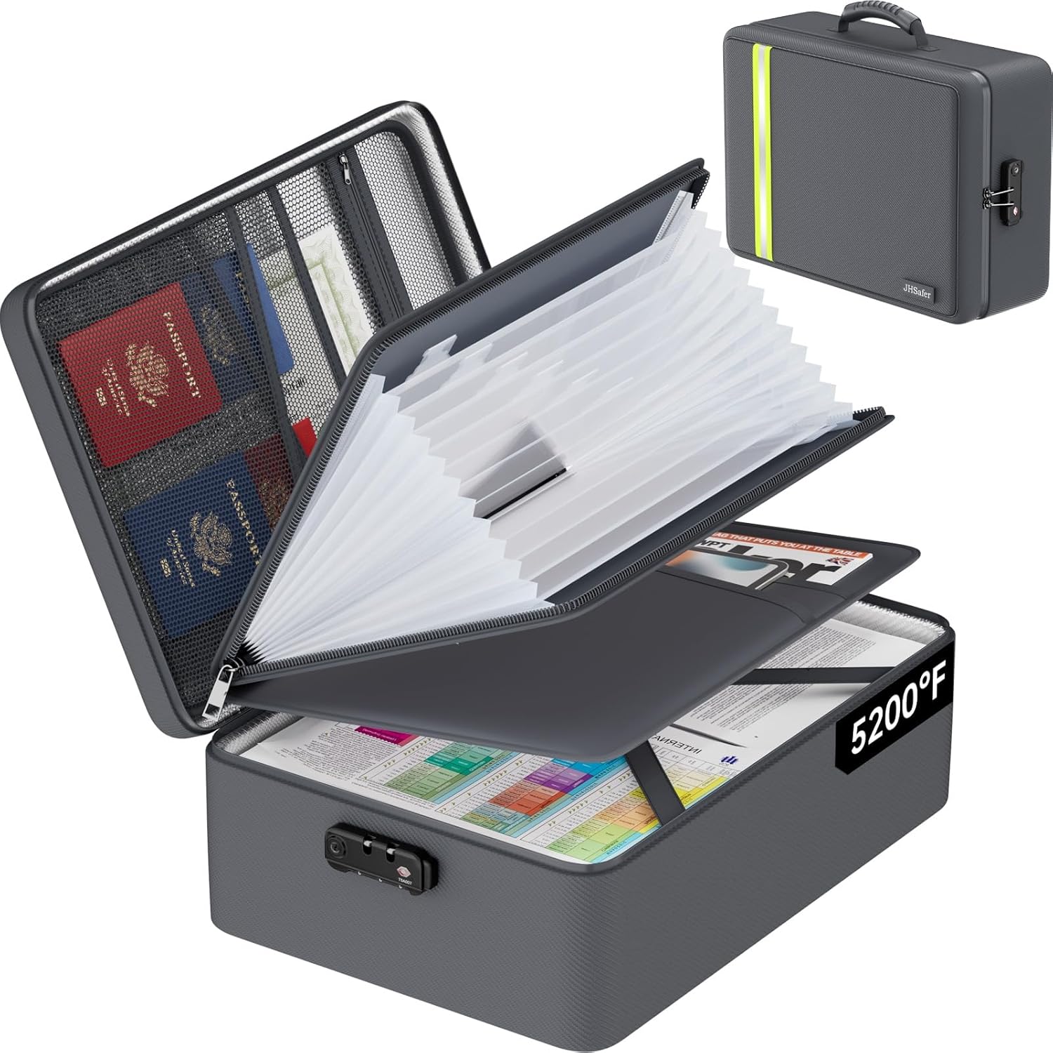 - Fireproof Waterproof Protecting Valuables: Our document organizer bag is made of non-itchy, non-stick, dust-proof silicone-coated fiberglass with aluminum foil interior that withstand temperatures up to 5200°F which has been passed by SGS TEST(UL94 VTM-0 Certified). High-quality fireproof stitching and waterproof zippers make the fireproof document box has fire, water, moisture and smoke resistance. All-around protection for your important items and property