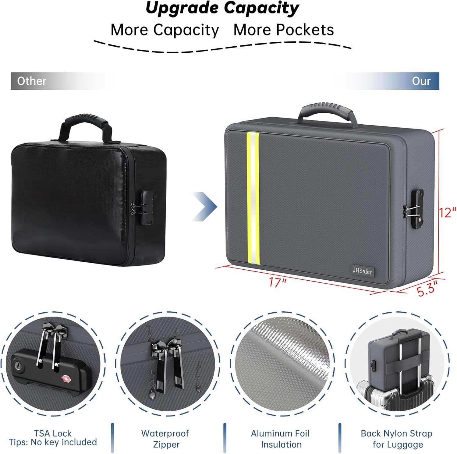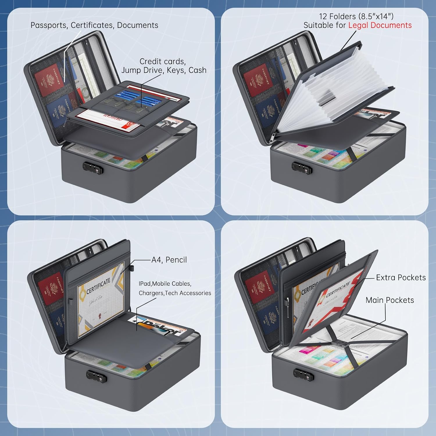 - 4-Layer Categorized Storage and Upgrade Size: Our 17"x 12"x 5.3" fireproof document bag has 4 levels of categorized storage space. Compare to other bag, we upgraded larger size, can hold more documents. 12 folder pages for document of legal document size and below. The internal compartment of the important document organizer is removable HOOK&LOOP design. Can store passports, legal documents, A4 papers, certificates, ID cards, credit cards, cash, chargers, electronic accessories, etc