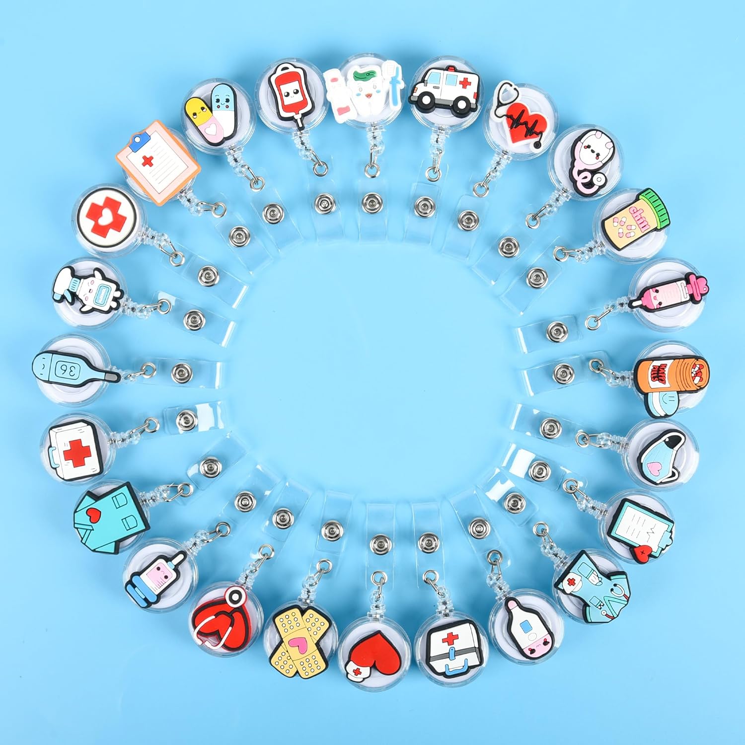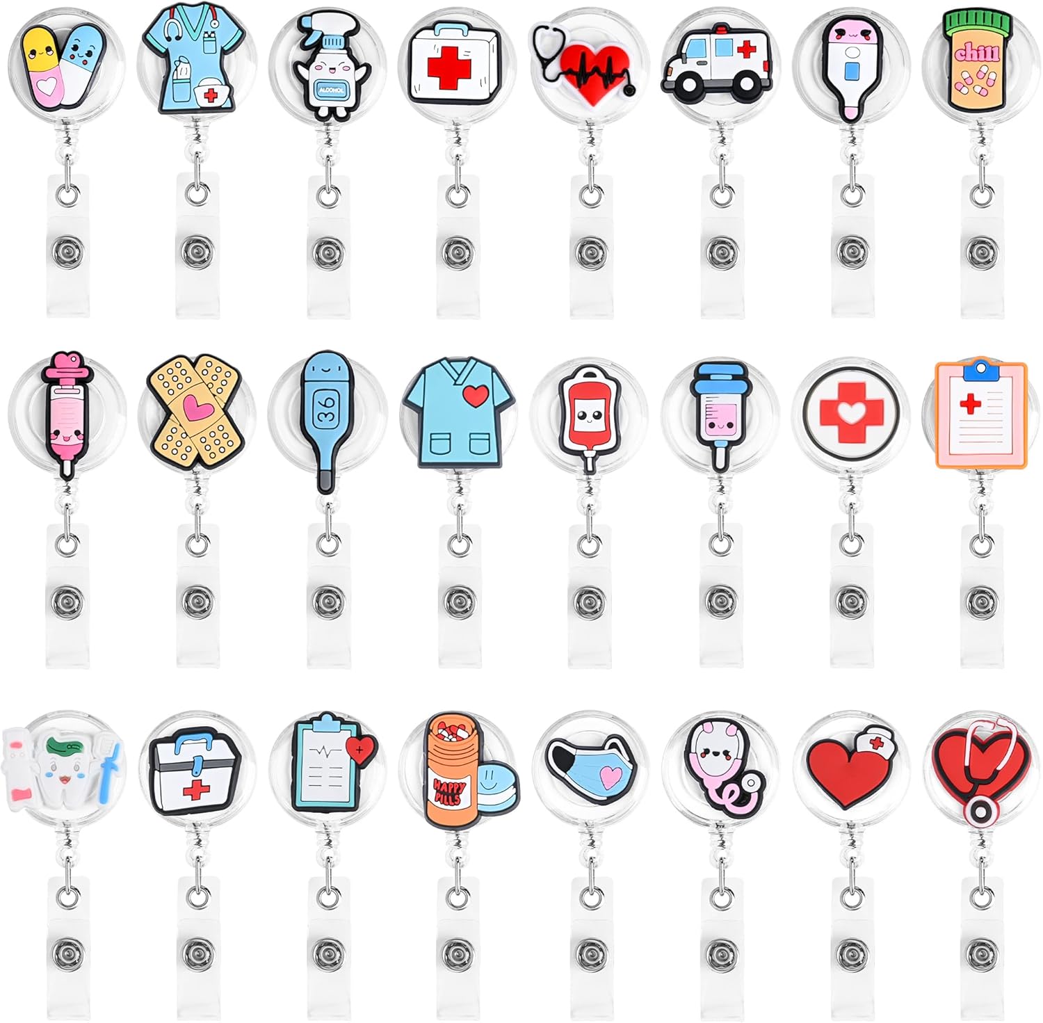 - Package includes: 24 pack retractable badge reels with 24 different lovely PVC medical decorations. a sufficient number is enough to meet your daily use. You can also use these badge reels as medical assistant gifts for your friends.