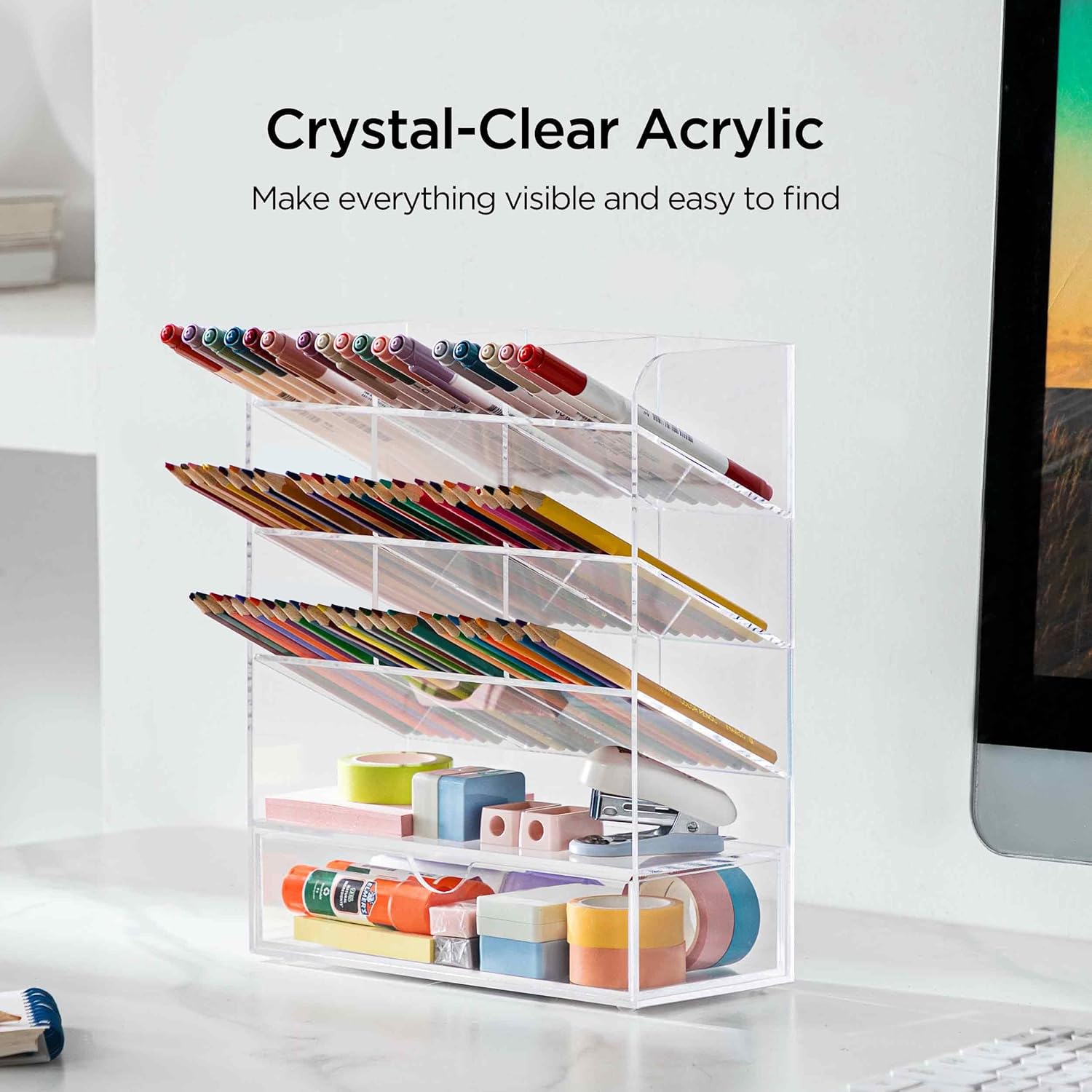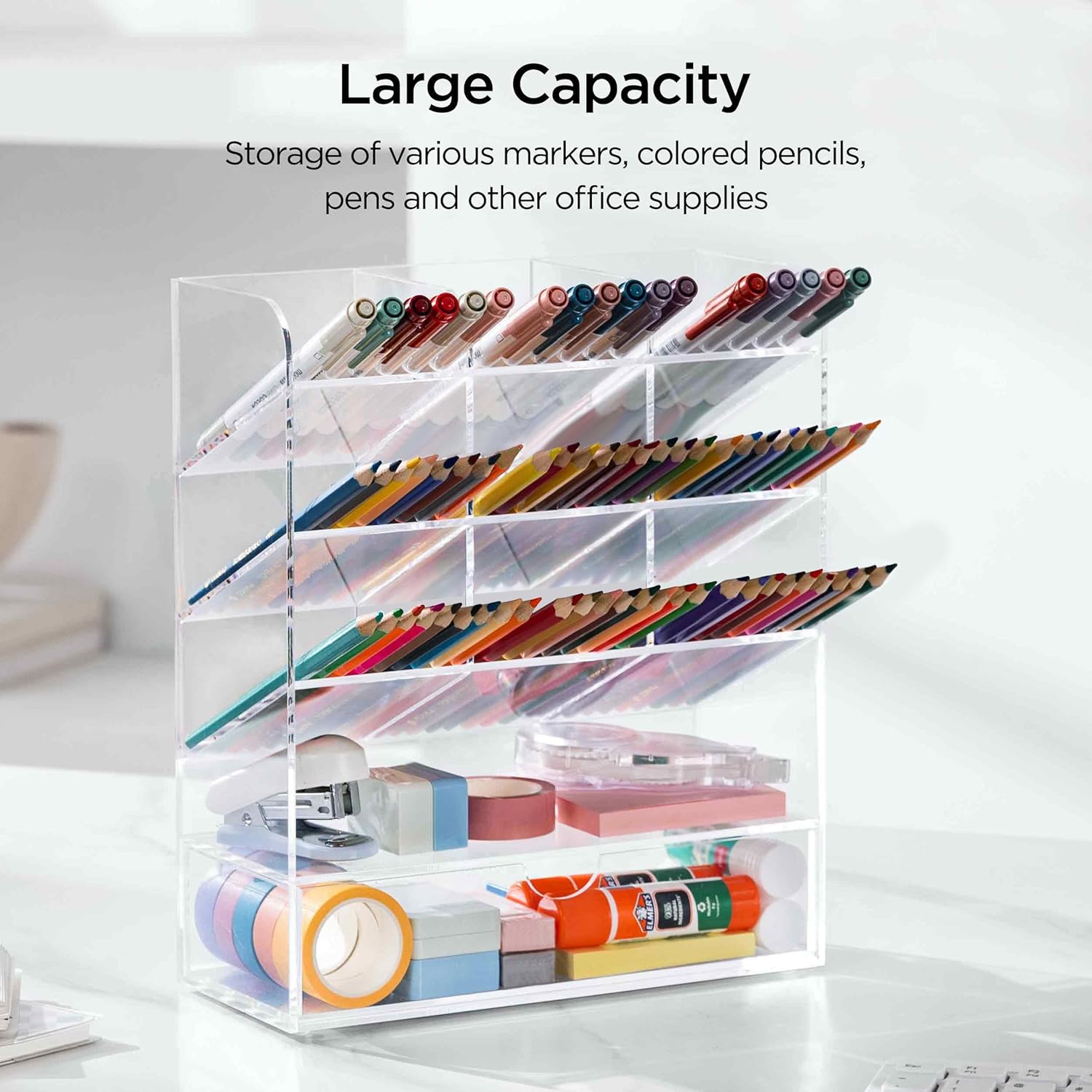 HBlife Acrylic Pen Desk Organizer with Drawer, Clear Vertical Marker Organizer with 11 Compartments, Angled Large Stationary Pencil Display Holder, Art Supplies Organizer for Desk, School and Home