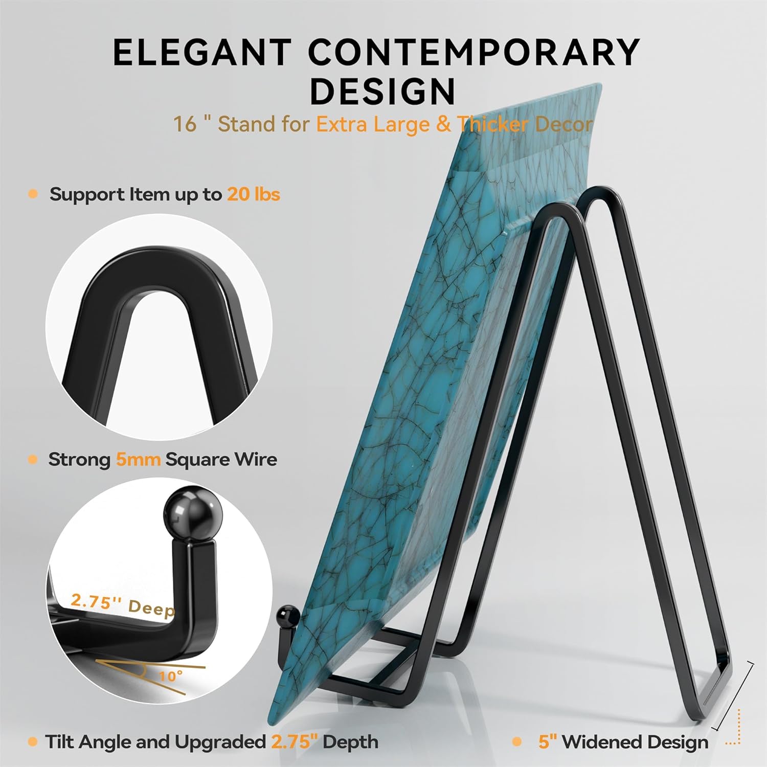 - Versatile 16 Inch Plate Holder: Designed with a 2.75-inch deep lip, 10° tilt angle, and a 5-inch wide base, this stand securely holds items from 16 to 36 inches tall and up to 25 lbs, making it perfect for extra large plates, platters, posters, picture frames, and decor.