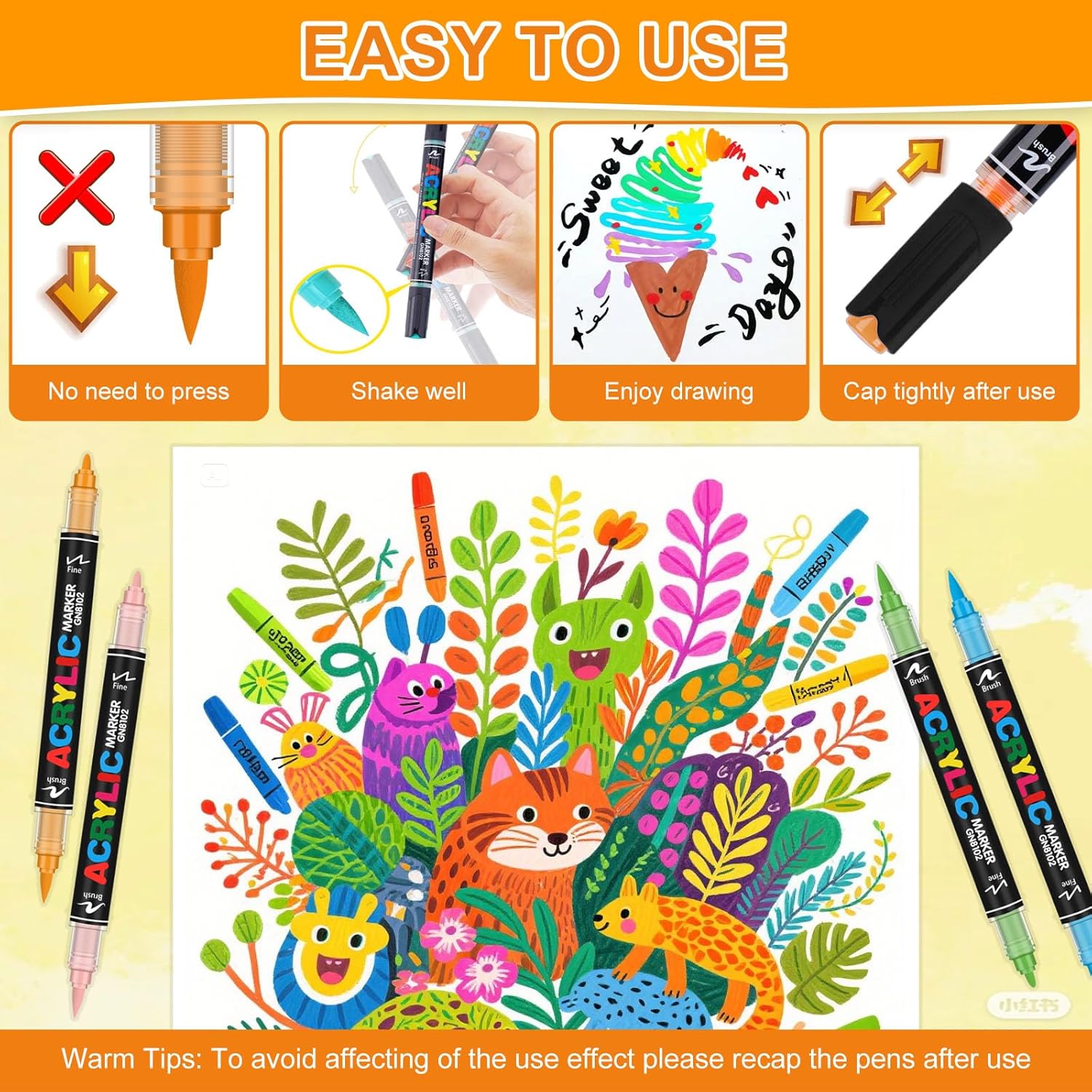 - 🎁 Ideal Gift for Creatives – A Perfect Christmas Present This complete set of brush acrylic paint markers is an ideal Christmas present for artists of all ages. The vibrant color range, durable ink, and dual tips make it the perfect gift for anyone who loves crafts, painting, and DIY. Surprise your loved ones with these high-quality paint pens and let their creativity shine.