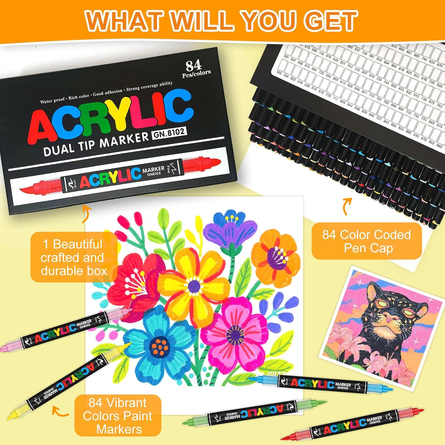 84 Colors Dual Tip Acrylic Paint Pens, 0.5-5MM Brush Tip & 1 MM Fine Tip Acrylic Paint Markers for Stone, Glass, Canvas, Rocks, Wood & More – Vibrant paint Markers and PAINT PENS for Crafting & DIY