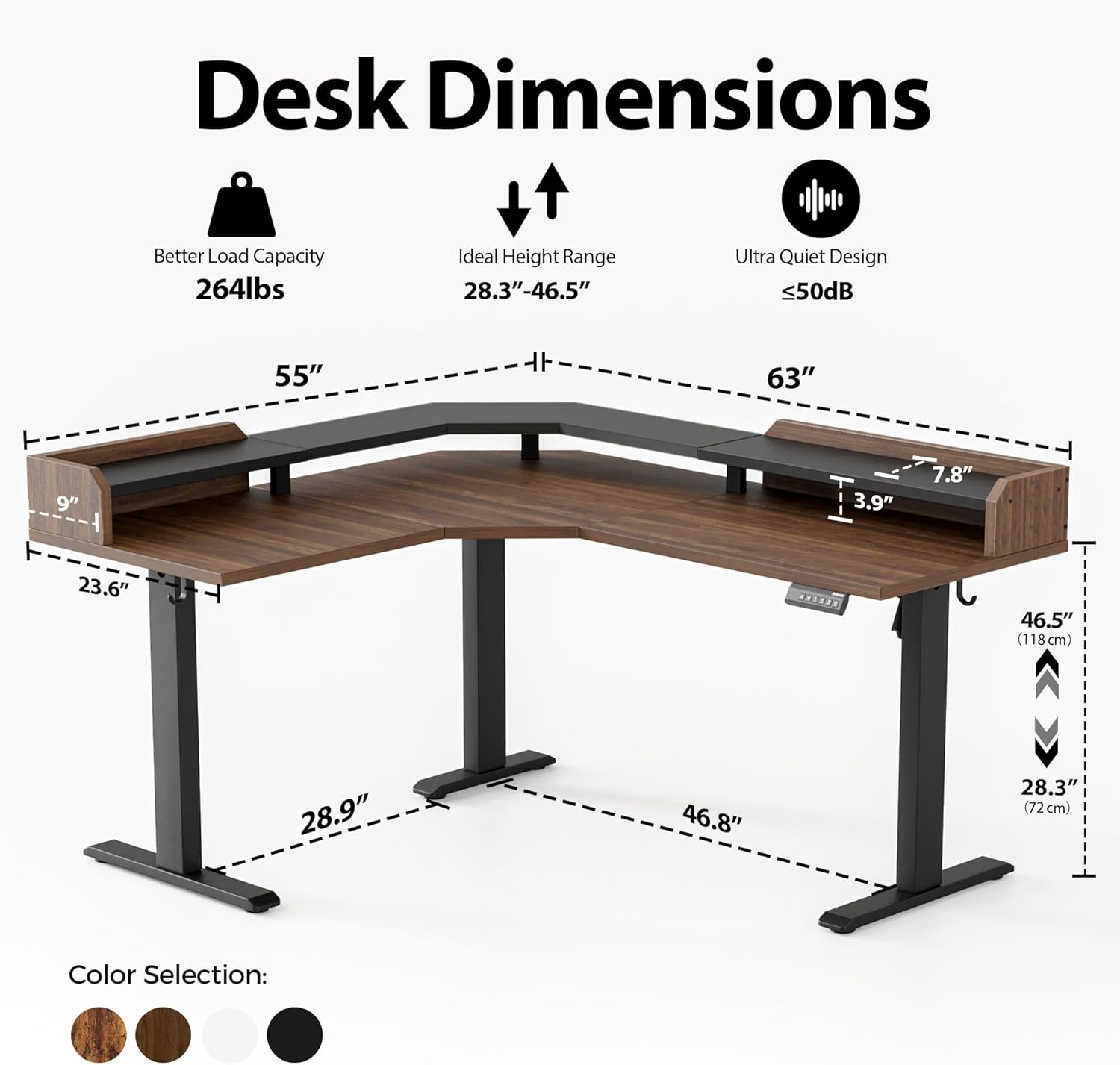 Agilestic L Shaped Standing Desk, Adjustable Height Corner Gaming Desk with Shelf, Sit Stand Up Desk, 63 x 55 Inch Home Office Computer Table, Dark Walnut
