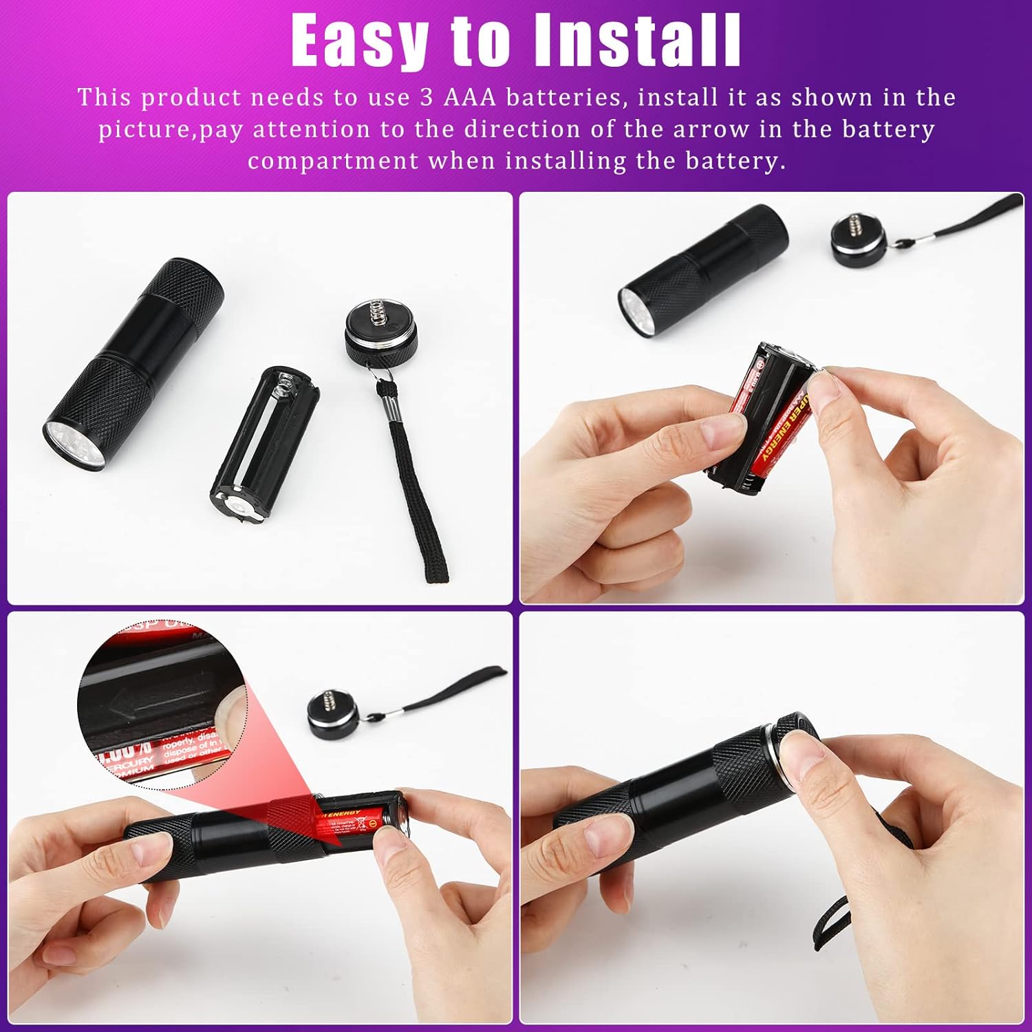 - Sufficient Lamps: the UV light flashlight is equipped with 9 small LED lights and powered with 3 AAA battery (which are not included), with a lighting time that can continue for 6 to 8 hours with a tail button switch, and the wavelength can reach 395 to 400 nm; Please note that the UV flashlight is not allowed to directly irradiate naked eyes