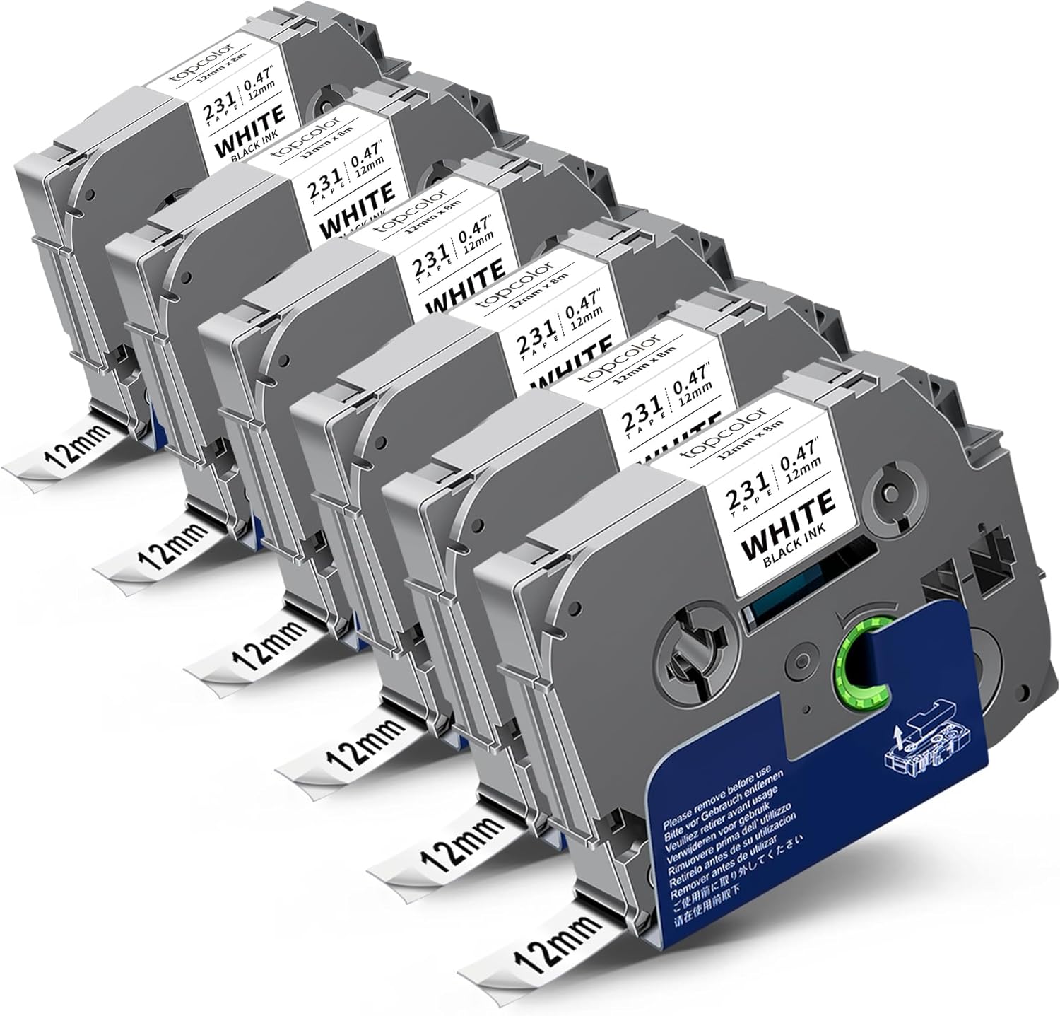 6-Pack Tze231 12mm Label Maker Tape Compatible for Brother P Touch Label Tape 12mm 0.47 White Tze-231 Tz231 Tze Tz 12mm 1/2" Laminated White for PT-D210 PT-D202 PT-D220 PT-D410 PTD600 PTD400