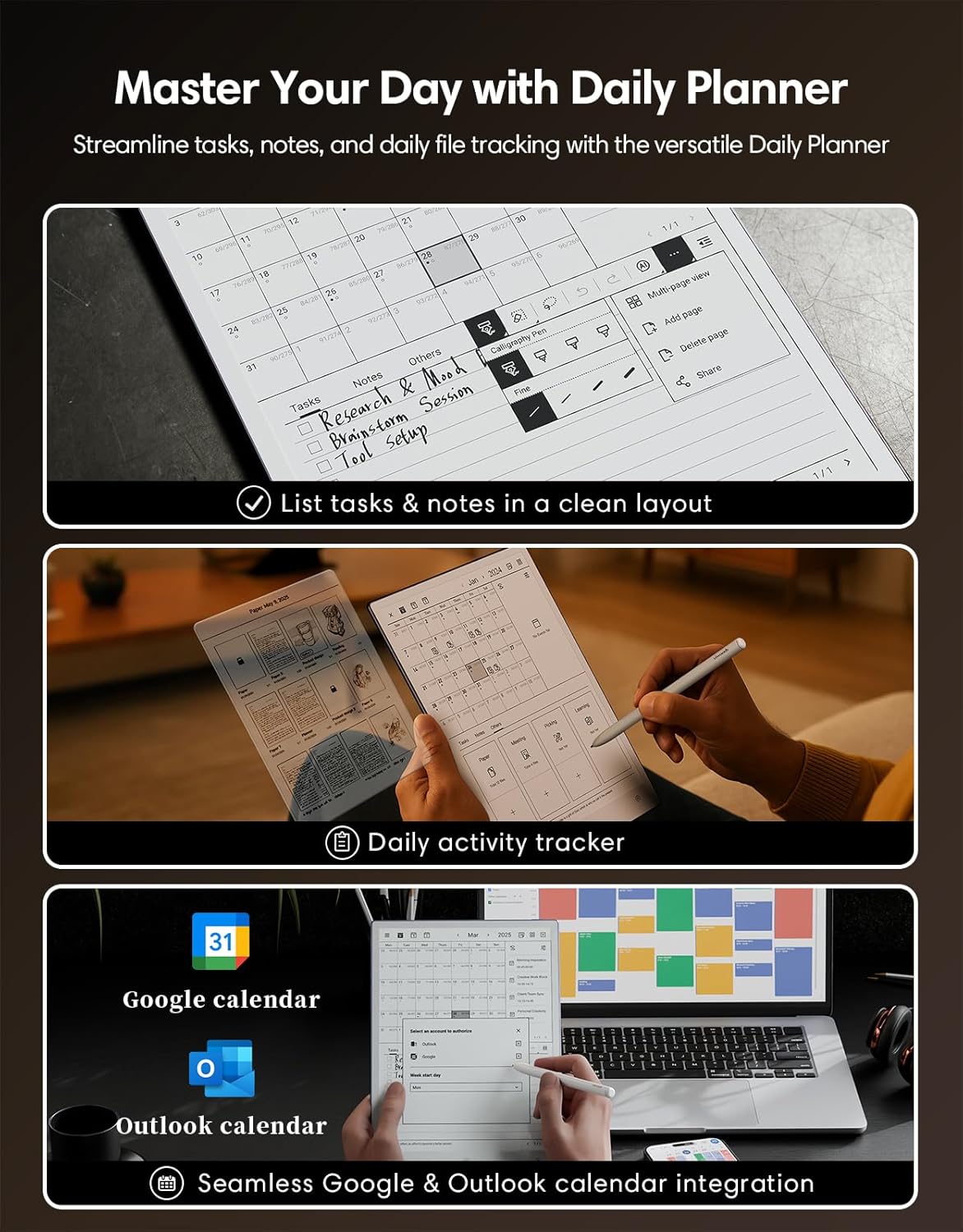 - YOUR SMART DAILY PLANNER: AiPaper’s Daily feature keeps you organized and productive by combining task management, document tracking, and calendar integration. Plan your day with ease, automatically sort notes and activities by date, and sync with Google or Outlook calendars for a streamlined schedule. Perfect for work, study, or personal projects, it’s your ultimate tool for staying on top of everything