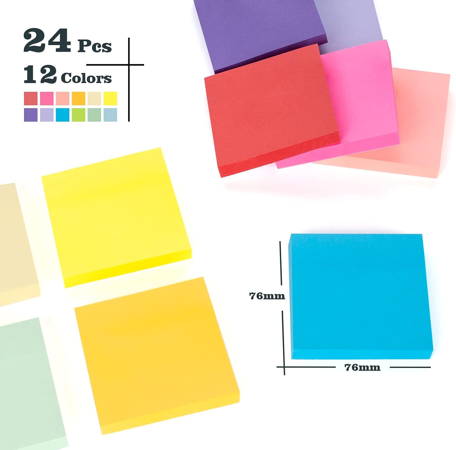 24 Pack Sticky Notes - 3 x 3 Inch Large Memo Pads with 2X Sticking Power,12 Bright Colors Sticky Pads,100 Sheets/Pad - 2400 PCS Super Sticky & Repositionable for Office,Notebook,School,and Daily Use