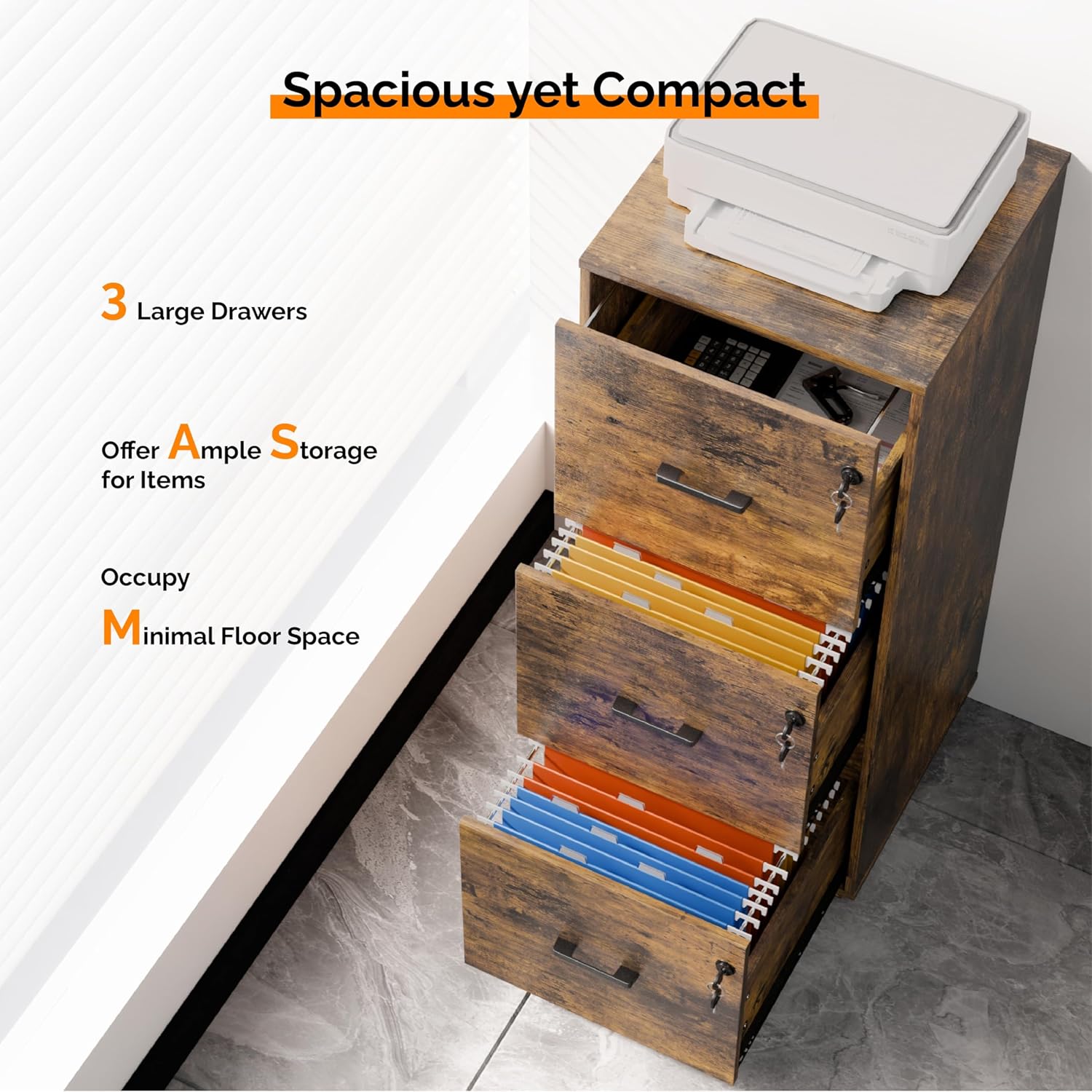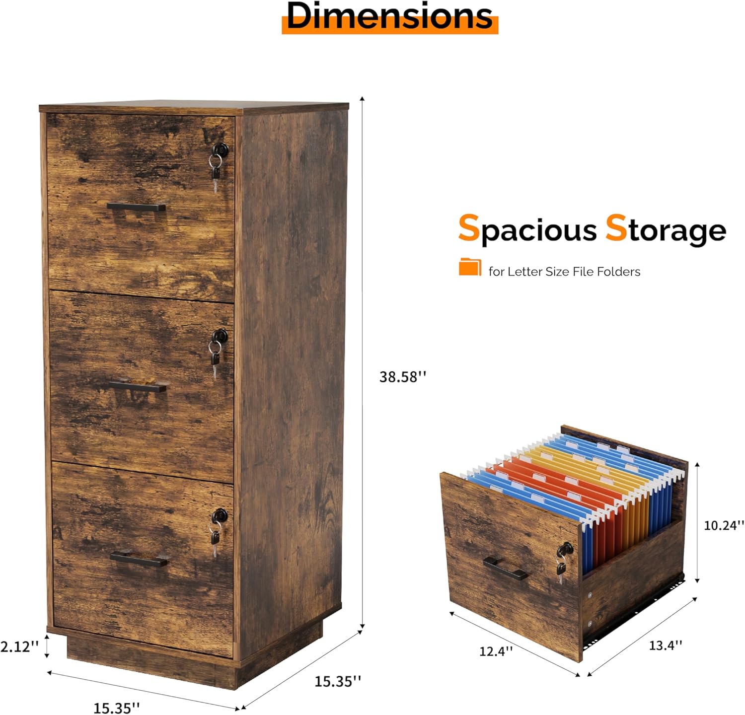 VINGLI 3 Drawer File Cabinet with Lock, Home Office Filing Organizer, for Letter Size File Folder Storage, Wood Tall Vertical Filing Cabinet, Printer Stand, Archivador (Rustic Brown)