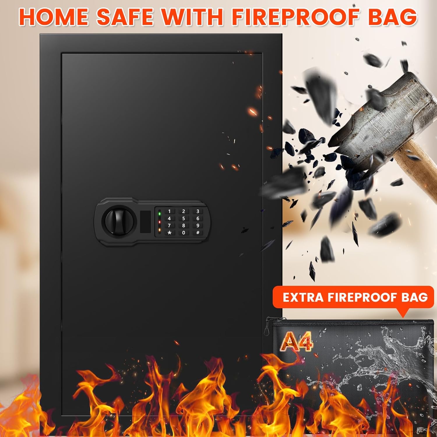 - Large Capacity Home Safe & Fireproof Bag: 4.5 cubic large capacity safe can protect almost all valuable assets and belongings, such as cash, Jewelry, medication, home protection, etc. The combination of a digital safe and a fireproof bag can protect your valuables from fire, hurricanes and earthquakes. This safe is perfect for securing items away from kids, thieves and people you don't trust