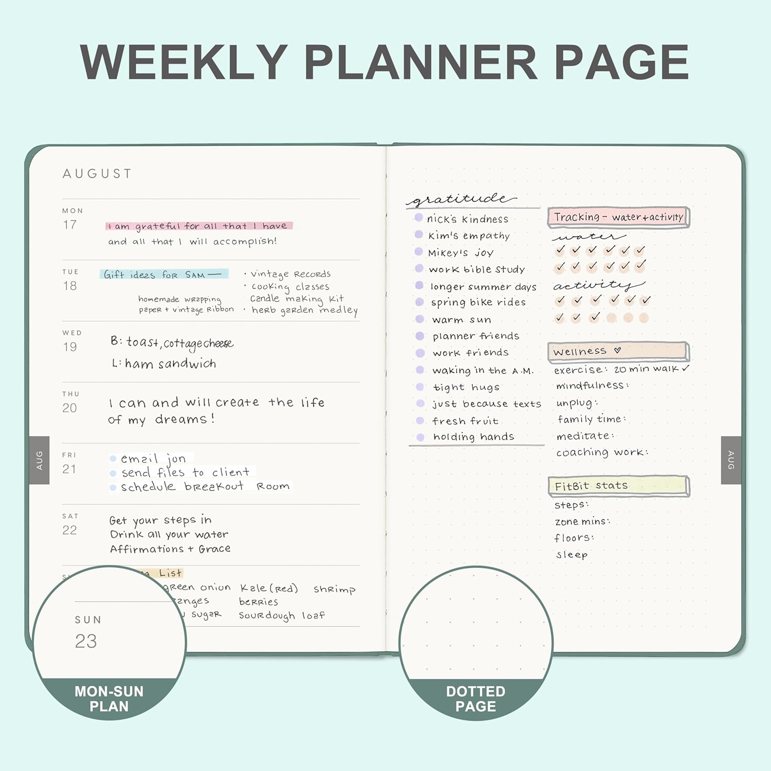 - WEEKLY VIEW:From Monday to Sunday, it provides ample space for line writing, and the dotted page on the right can be used to design and paint, which is easy to manage daily tasks.