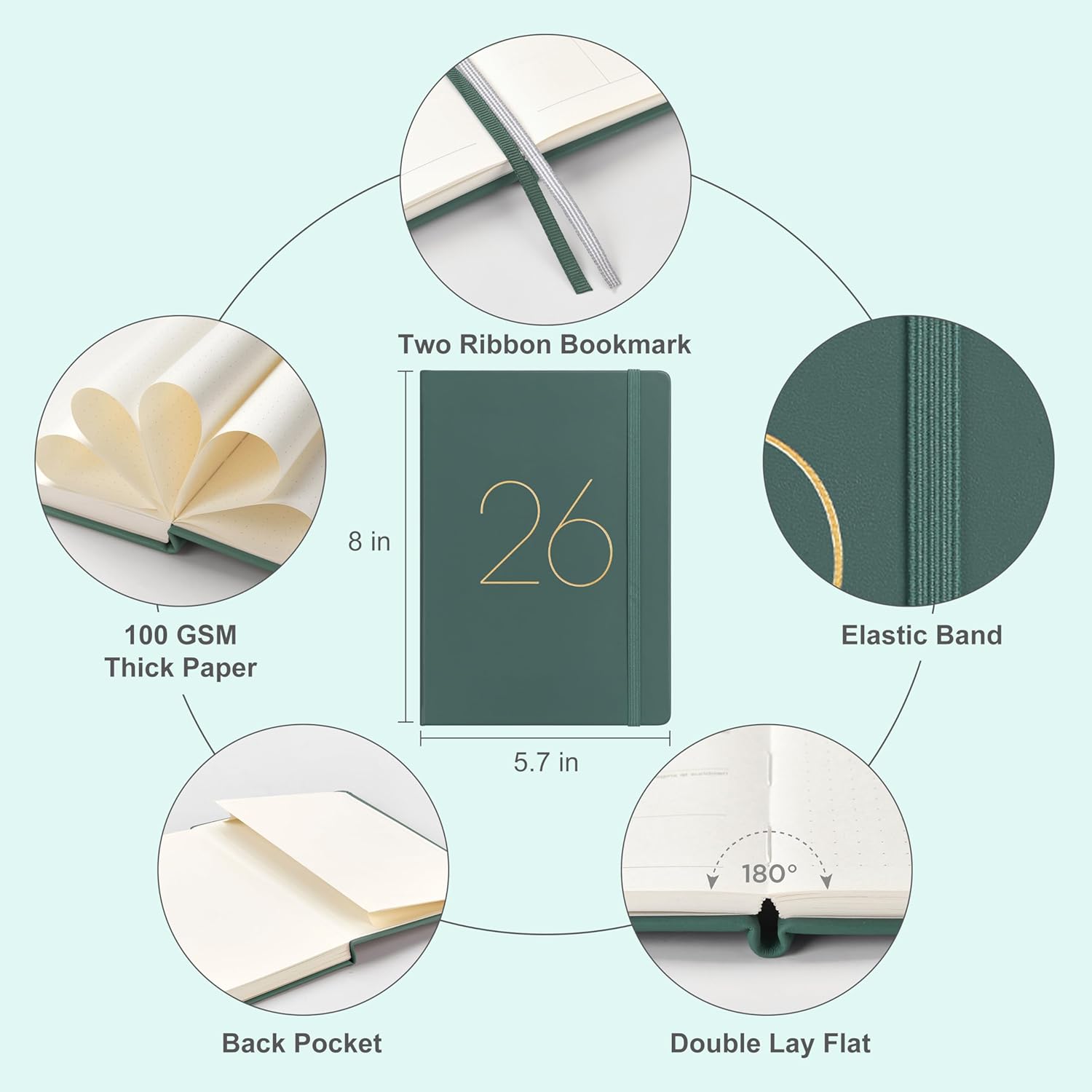 And Per Se 2026 Planner-Daily, Weekly & 15-Monthly Leather Hardcover Planner, 5.7" x 8", Daily Schedule, Monthly Tabs, 100 GSM Thick Paper, Back Pocket(Green)