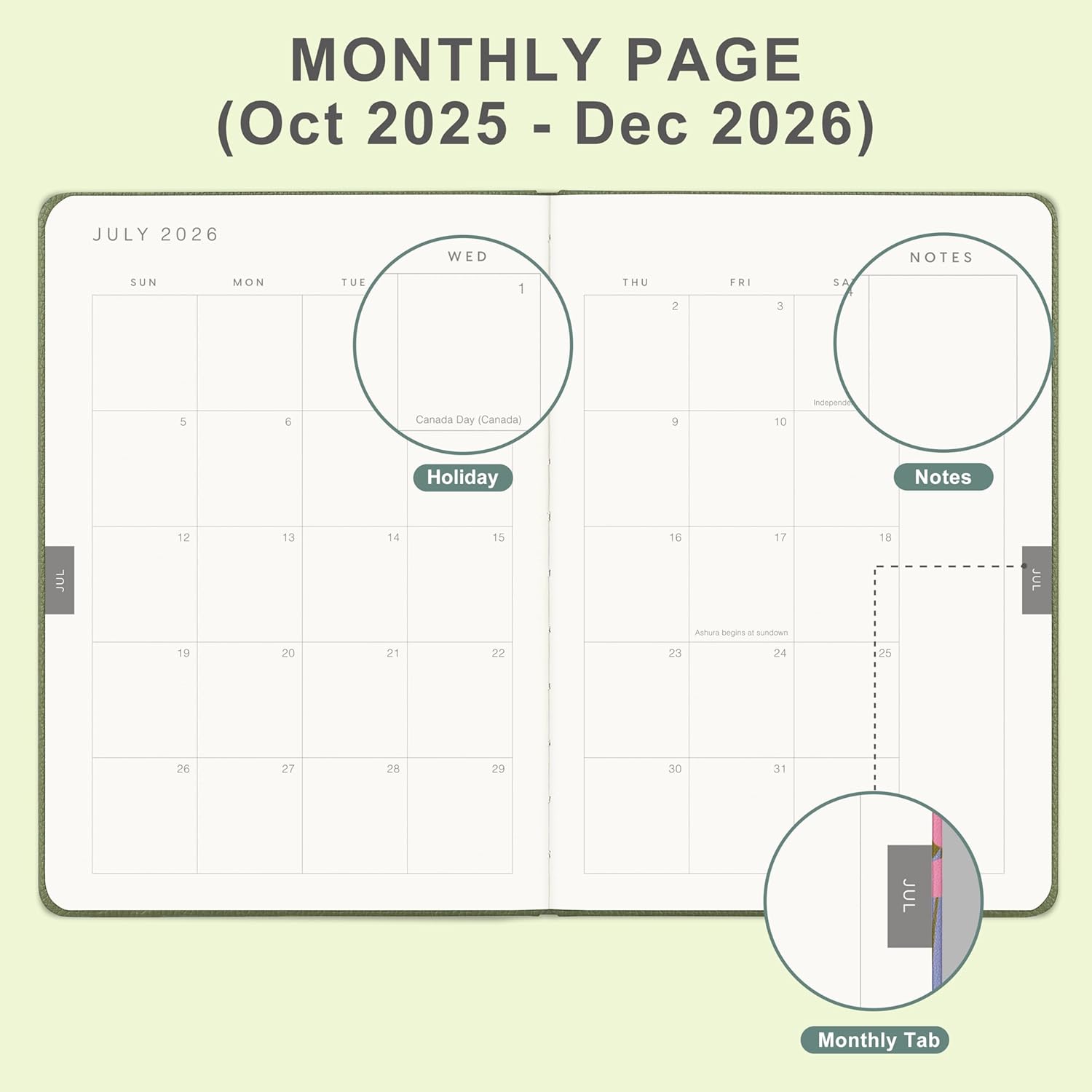 - MONTHLY OVERVIEW:Each date box provides enough writing space, including a display of holidays for each month, and the right notes row is additional planning space. 2 Ribbon bookmarks and month displays for easy navigation and lookup.