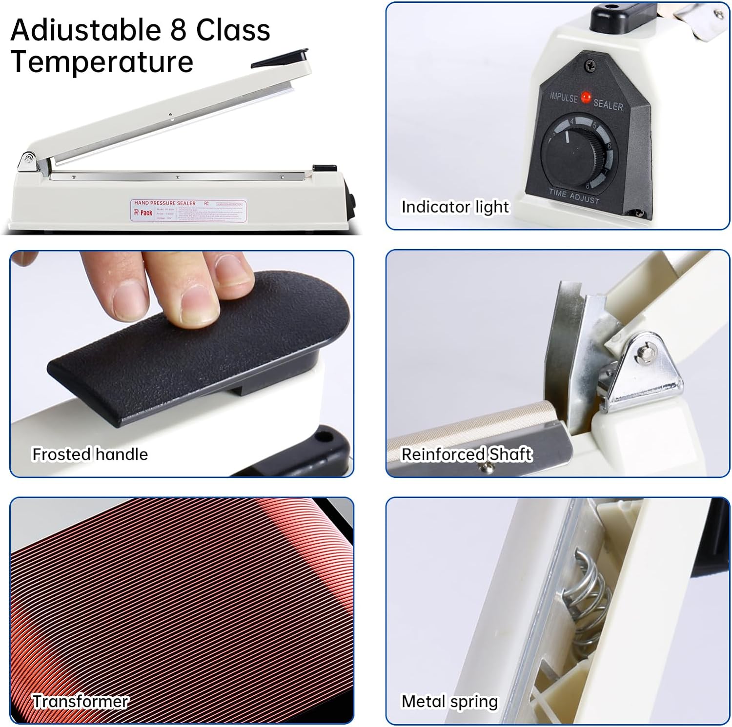 - [Instantly use and optimal results]: With no warm-up time needed, our R-PACK Impulse Heat Sealer is ready to use right away. Simply keep the handle pressed down for 3-5 seconds to achieve perfect seals every time. The lightweight design and 8 stalls temperature adjustment feature allow for easy operation and compatibility with different materials bags.