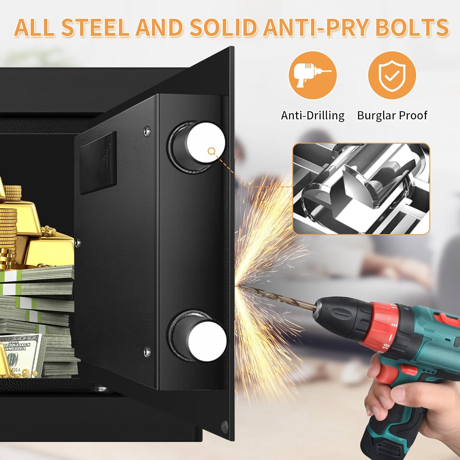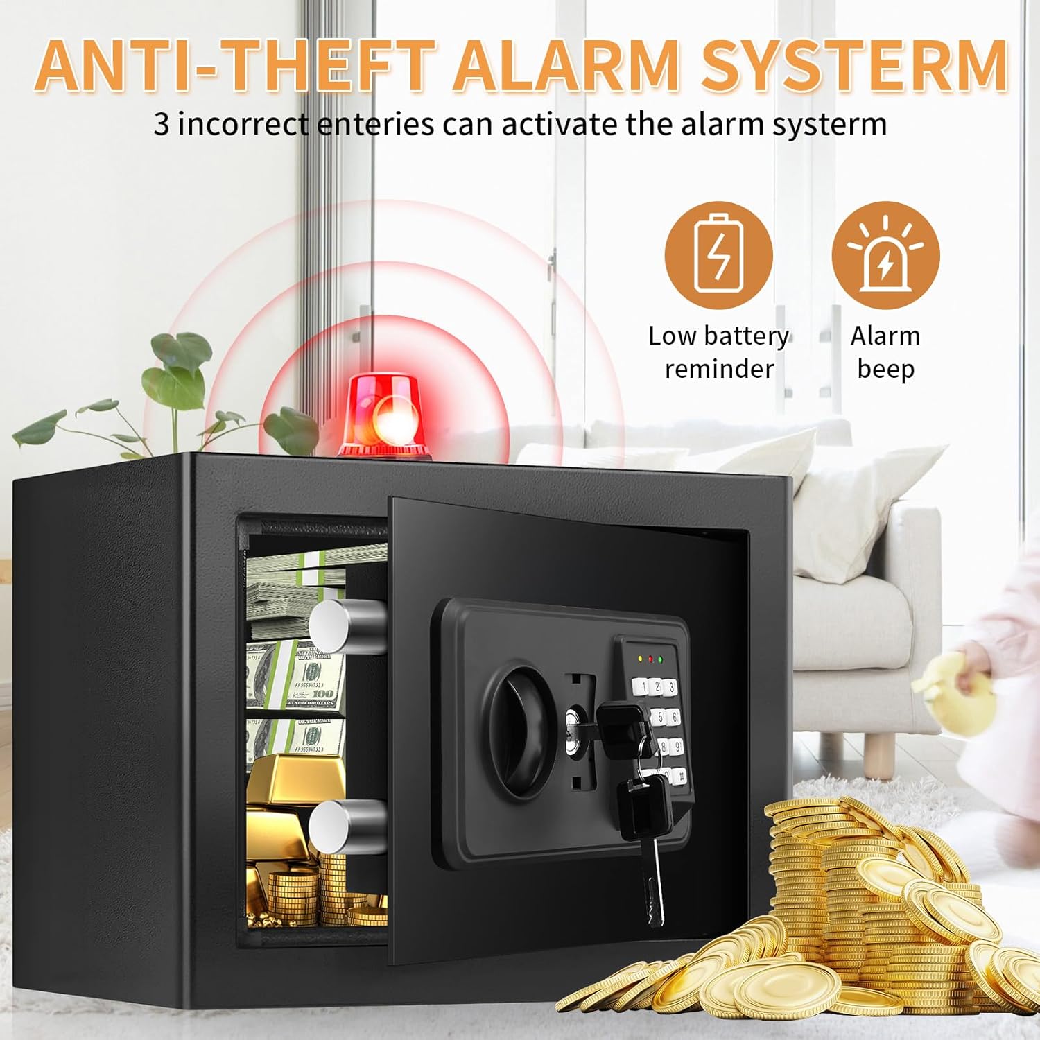 - ANTI-THEFT ALARM & ANCHORING DESIGN: Our home safe comes with a dual alarm system to prevent password guessing and effectively deter unauthorized access. Enter the wrong password 3 times in a row will activate the alarm system and the safe will lock for 20 seconds. Anchoring design makes you easily fix the safe to the wall or floor, improving safety and reliability