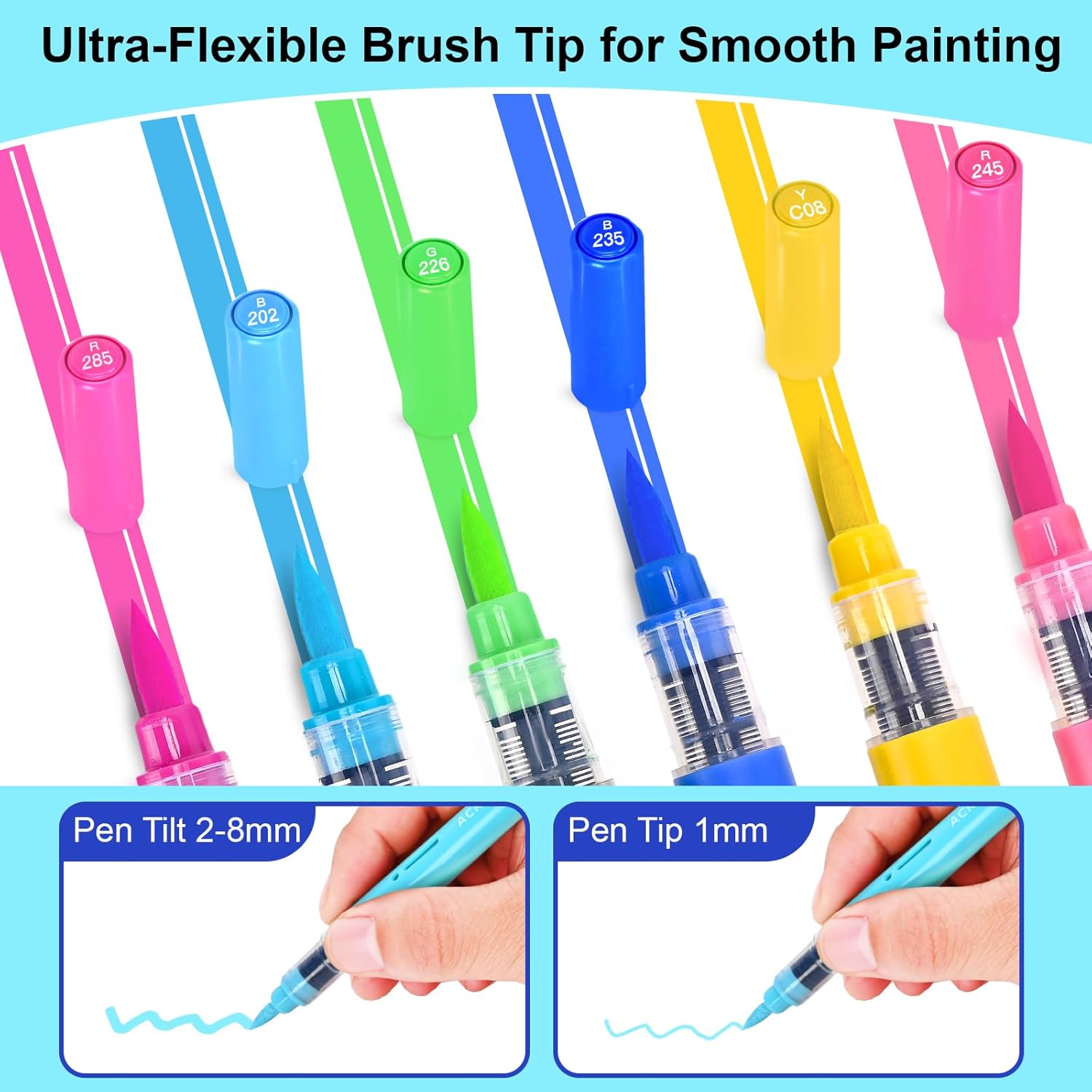 - Flexible Brush Tip, No Clogging: Brush tips of 1-8mm writing width, allow you to create different strokes by changing the brush pressure, meet your needs both for detail outlining and large area coloring. High-quality brush tip is more friction-resistant than ordinary cotton nibs, no linting, long-lasting, Artugn 60 colors acrylic markers set meets a wide range of creative needs.
