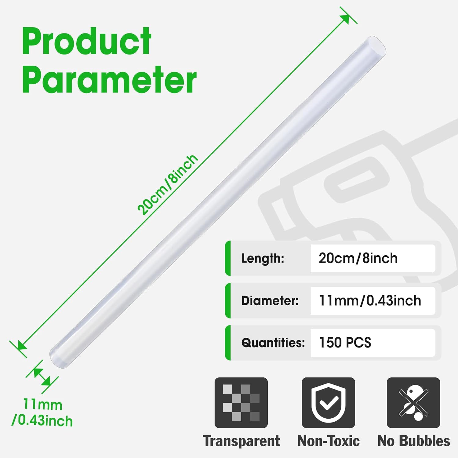 150 PCS Hot Glue Sticks, Full Size 8" Long x 0.43" Diameter Glue Sticks for Glue Gun, Widely Used in Wood, Metal, Glass, Plastic, Floral, Fabric, and More
