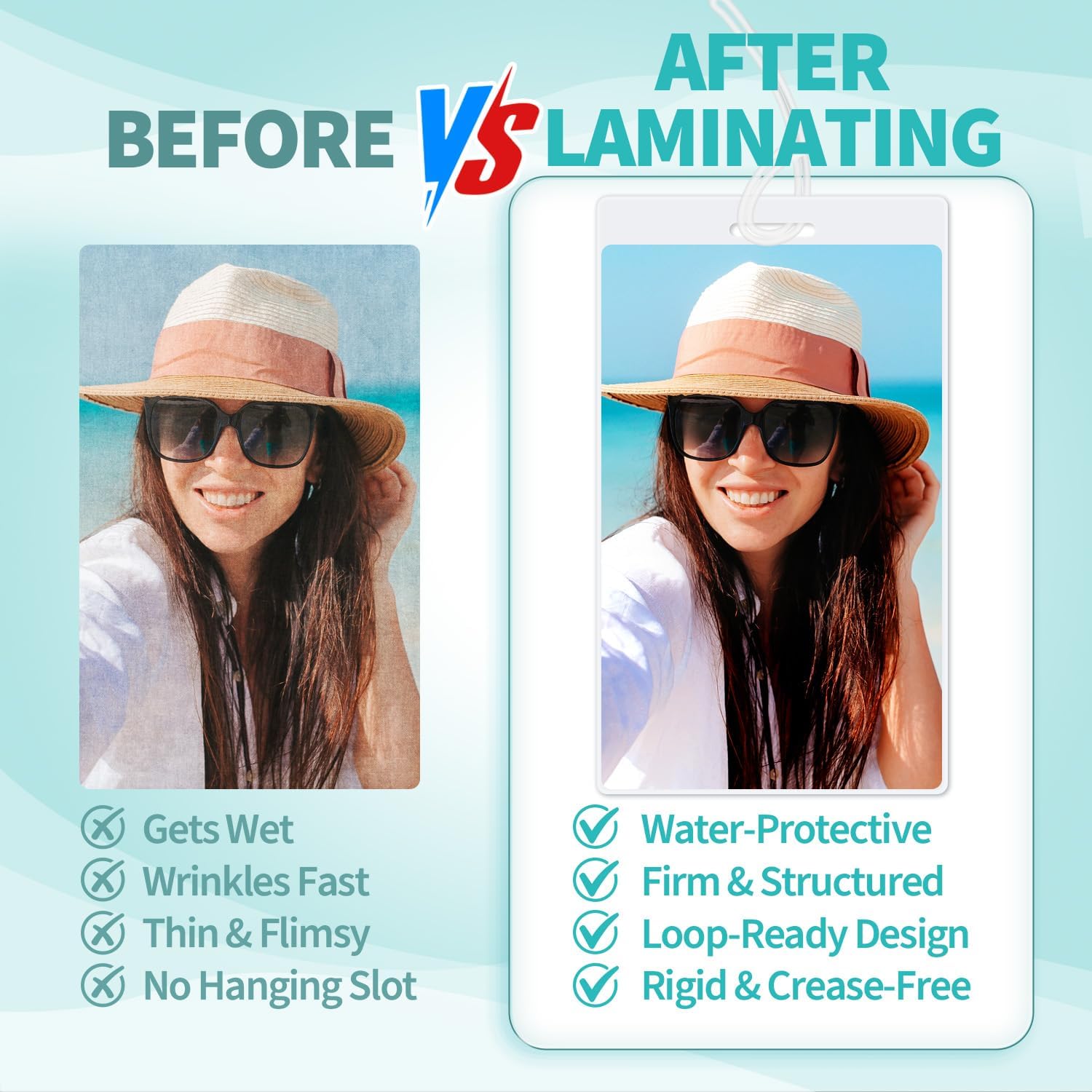 - 【High Transparency】 These luggage tag laminating pouches feature a high-gloss, ultra-clear surface that enhances text sharpness and color contrast. They protect against creases, smudges, and dust, with static-free properties that help preserve a clean, professional appearance for your ID badges and travel tags.