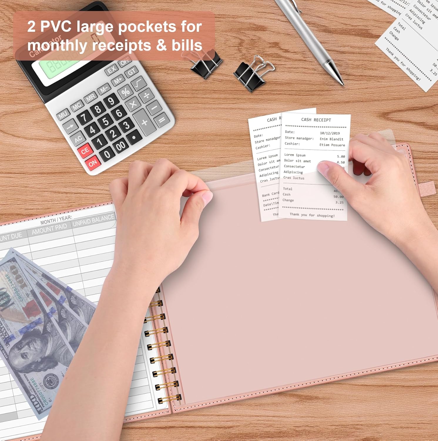- Practical Design: The bill book is PU leather hardcover, with double-wire spiral binding that allows it to lay flat 360°; 100gsm thick paper, comes with an elastic band, pen loop, bookmarks, and 2 large pockets for storing monthly receipts & bills