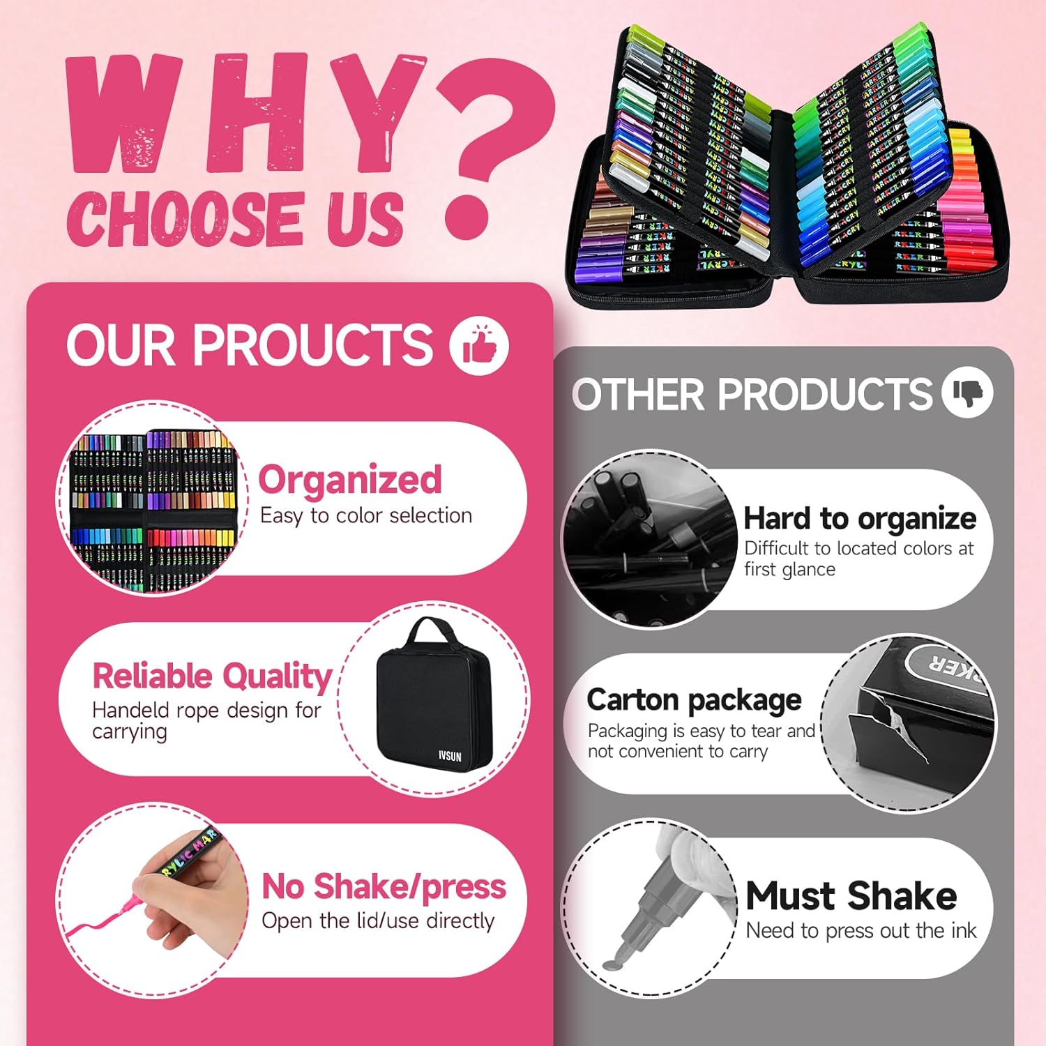 IVSUN Acrylic Paint Pens, 60 Colors Dual Tip Paint Markers with Fine Tip and Brush Tip for Stone, Wood, Canvas, Calligraphy, Ceramic, Metal, Glass, Rock Painting, DIY Crafts Art Supplies Kit