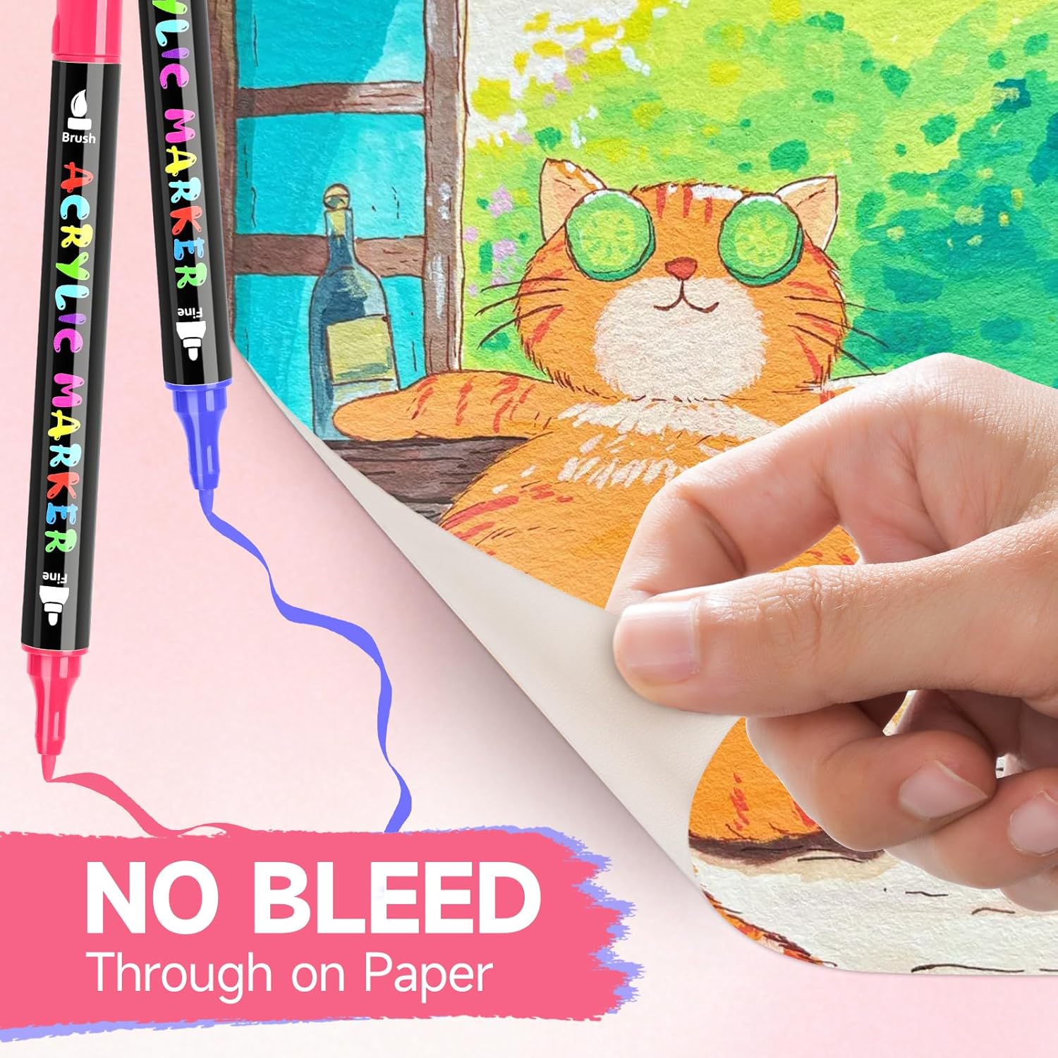 - Versatile Dual-Tip Design: Each Acrylic Paint Marker Pens contains two types of wear-resistant fiber nibs, ensuring even ink output and more convenient painting.One end features a 1mm fine tip for outlining and detailing intricate designs, while the other end has a 1-5mm brush tip for large areas of painting and coloring, allowing you to create different strokes by changing the brush pressure, saving the trouble of changing nibs, and bringing more convenience to your creation, meet the different needs of professionals and amateurs.
