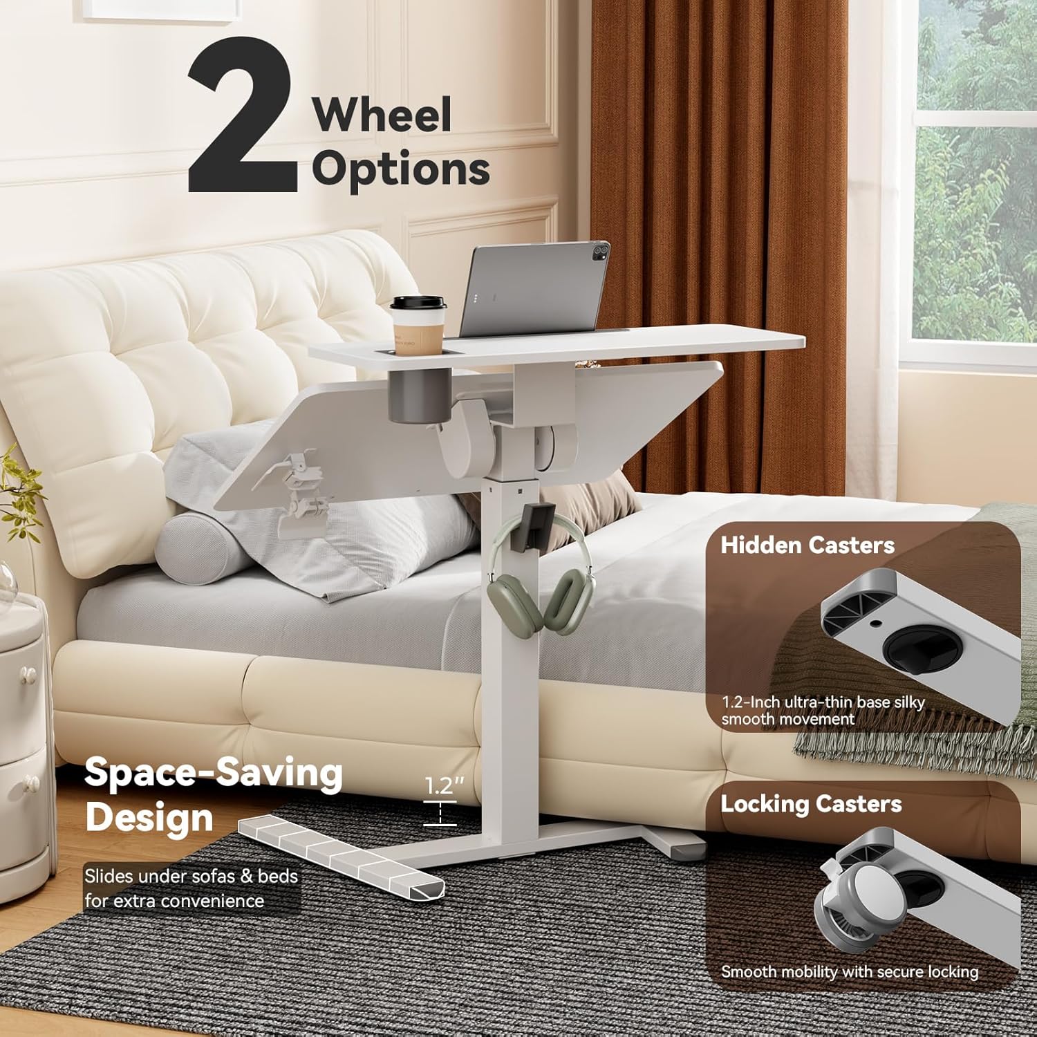 - Easy Moving Stand Up Desk: This portable desk on wheels has 4 hidden casters. The 1.2-inch slim base makes it perfect for couch or bedside use. You can choose to replace the 4 lockable casters to better fit the carpet and move it anywhere you want