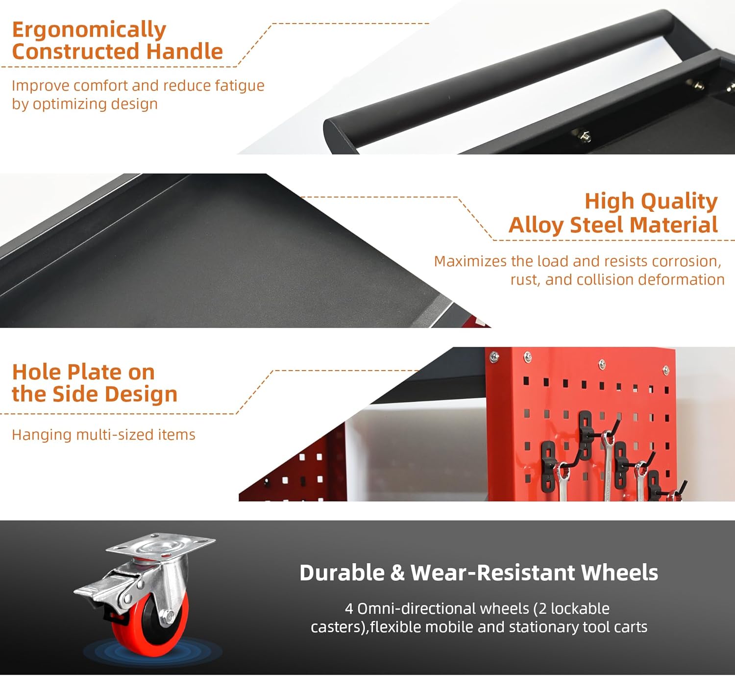 - Versatile for Various Applications: Tool cart is not only perfect for workshops and garages but also highly suitable for warehouses and various repair environments. Whether it's tools, parts, or other items, our rolling tool cart helps you keep everything organized with ease