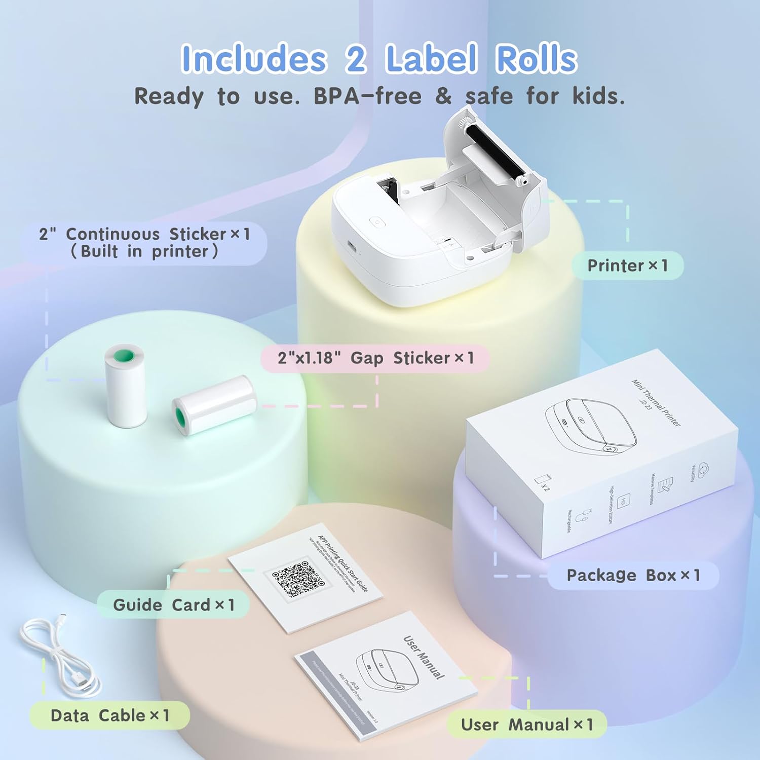- Ink-Free Thermal Printing Technology - Enjoy clean, cost-effective printing with advanced thermal technology—no ink, toner, or ribbons required. This upgraded version is compatible with both continuous and gap labels, as well as sticky or non-sticky paper. It also supports multiple roll types, including standard white, colored, and transparent sticker paper (2-inch width).