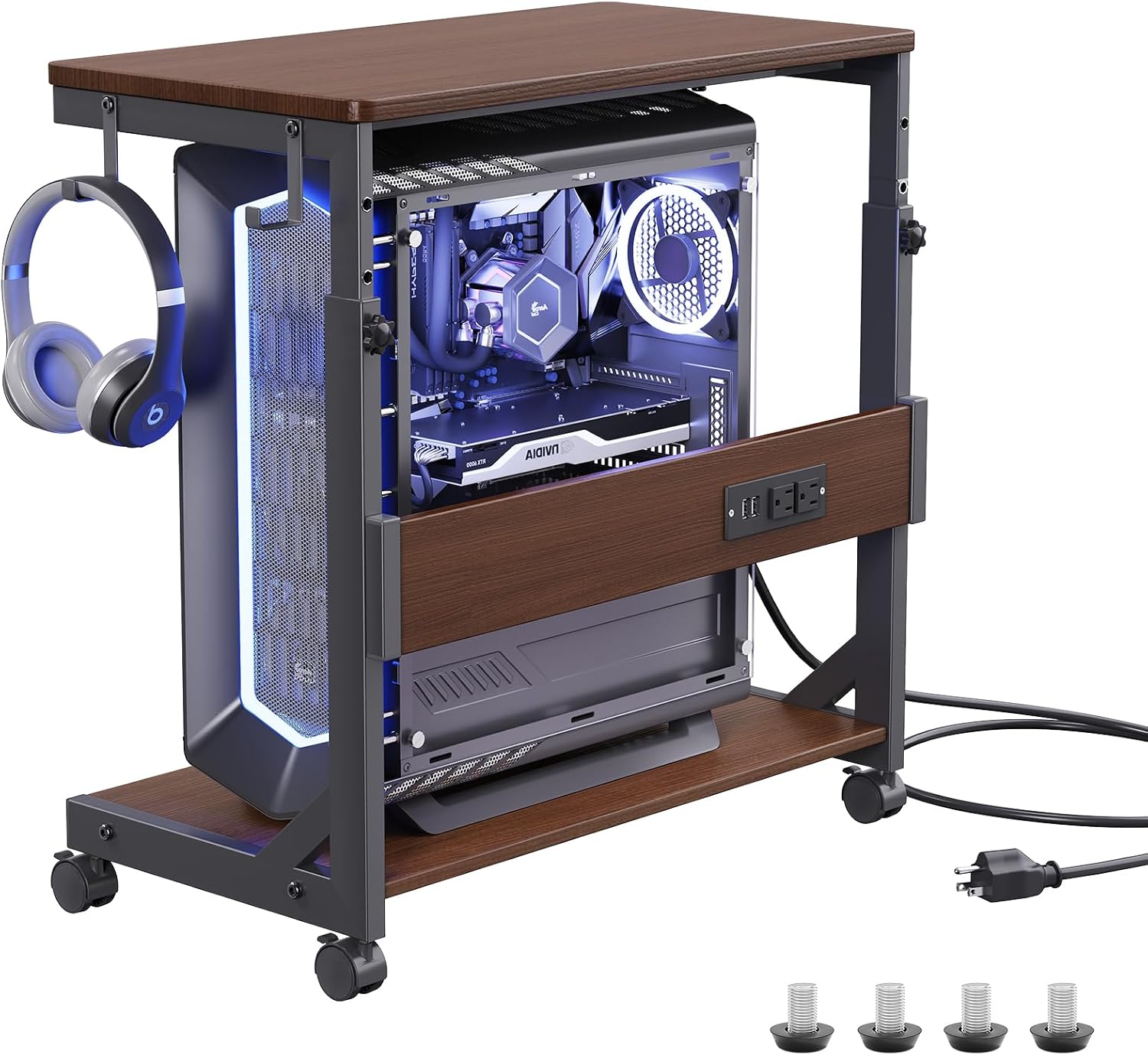 - Pc Tower Stand With Charging Station: This Mobile PC Standing with dual 120V/12A outlets and dual USB ports can power your laptop, smartphone, printer, tablet or any electronic device. Great for keeping an organized workspace. Plus, the PC Tower Rack doubles as a side table to provide additional power for your desk lamp