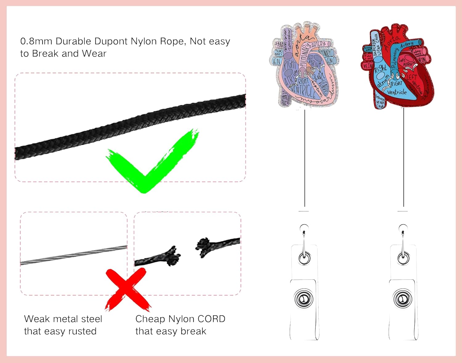 - Our cardiac ID card clip offers a retractable cord that extends up to 60.5cm, making the anatomy heart funny badge holder easy to scan in and out of the office. This nurse name tag holder ensures hassle-free access to your ID.