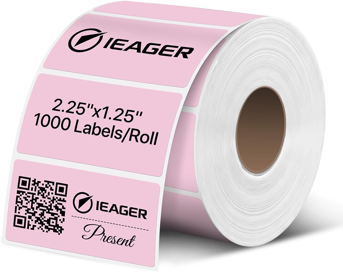 - Specifications: iEager 2.25" x 1.25" pink thermal label with perforation line, 1000 labels/roll. Paper tube inner diameter 1". No ink, toner or ribbons needed