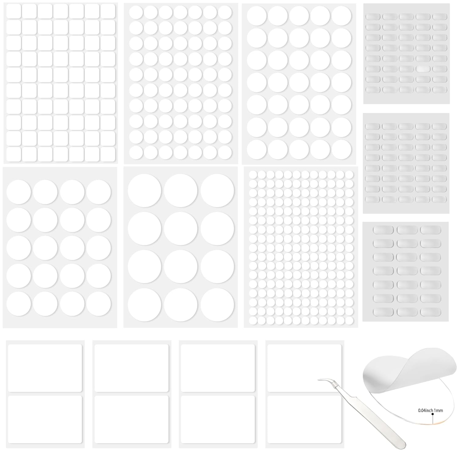 - Double Sided Sticky Tape Dot Set: You will receive 13 pack clear sticky tack in multi shape, 520 pieces totally, include round adhesive dots: 0.39 inch(204 pcs), 0.78 inch(70pcs), 1.18inch(35pcs), 1.57inch(20pcs), 1.96inch(12pcs); small oval: 0.51Ă—0.31 inch(80pcs) ; square: 0.78inch(70pcs); strip shapes: 0.39Ă—0.78inch(21pcs),2.12Ă—3.34inch(8pcs).