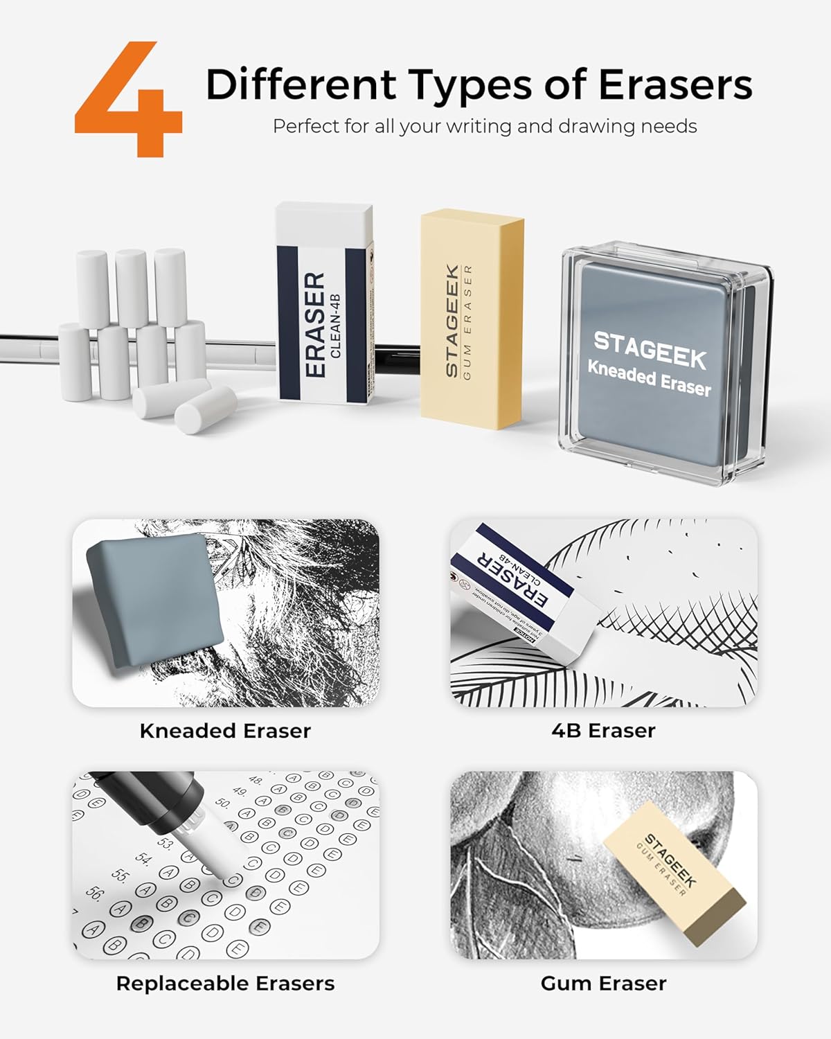 - Mechanical Pencil Set: The pencil set includes 1 premium 4B eraser, 1 kneaded eraser, and 1 tube of 3 tubes eraser refills (27 pieces) for clean corrections. Two double-hole lead sharpener is included for versatile tip maintenance, while the 2.0mm pencil cap features a built-in sharpener for quick adjustments