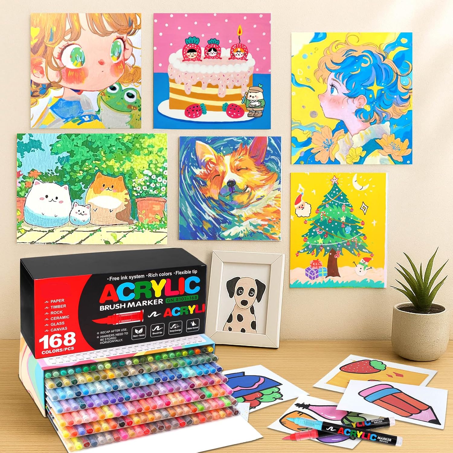 168 Acrylic Paint Markers, Soft Brush Tip Acrylic Markers for Rock Painting, Wood, Stone, Glass, Canvas, Fabric, Ceramic - Brush Tip Water Based Pens