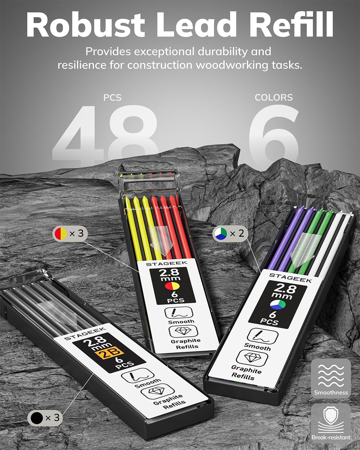 - Abundant & Robust Lead Refills: With a 2.8 mm thick lead in black, red, yellow, green, white and blue, our carpenter pencil delivers superior strength and resilience for construction woodworking tasks, reducing breakage and damage. Designed for extended use.