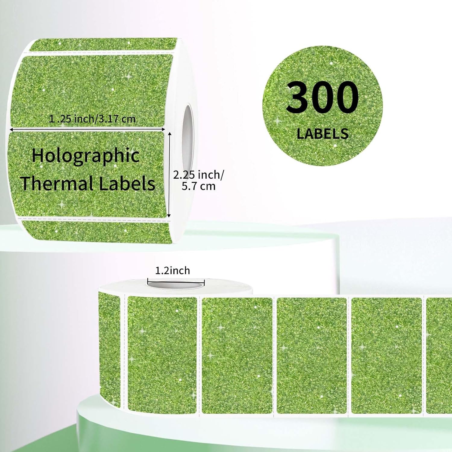 2.25"x1.25" Holographic Thermal Labels Stickers, Glitter Direct Thermal Printer Labels, Waterproof Self-Adhesive Address Shipping Label Stickers, 300 Sheet/ 1 Roll, Holographic Shiny Green