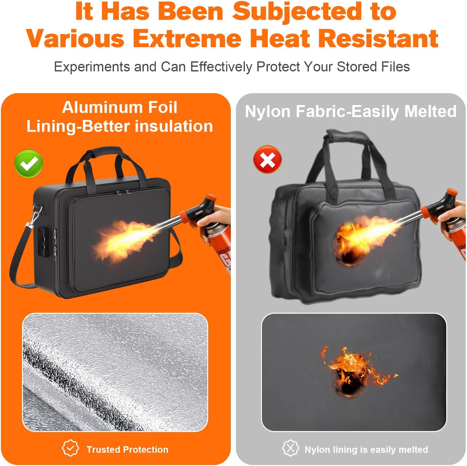 - 【5200°F Fireproof & Secure Locking System】protect your valuables with this fireproof box engineered to withstand extreme temperatures up to 5200°f. dual-layer insulation (fire-resistant silicone-coated cotton + aluminum foil) ensures double protection against flames and heat, passed the extreme heat resistance test. the fireproof document safe box features a reinforced waterproof zipper and moisture-resistant lining, safeguarding passports, legal files, and electronics in fires, floods, or emergencies.