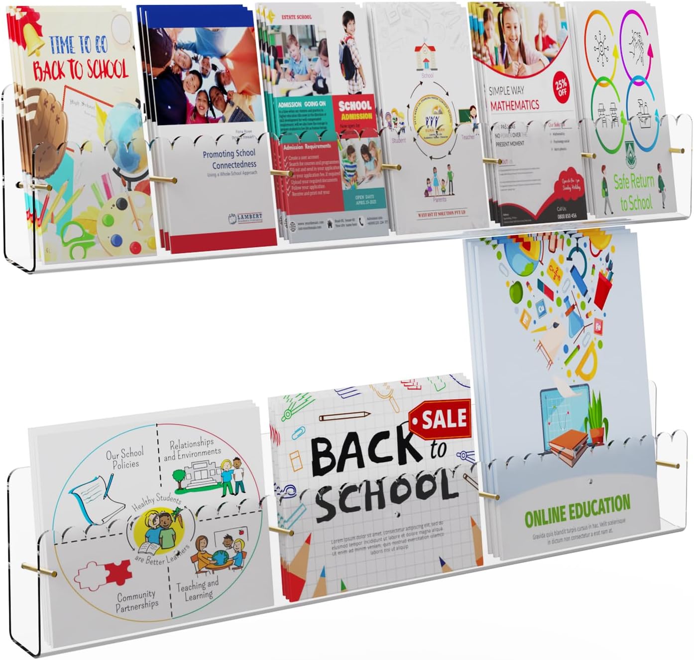 Brochure Holder Wall Mount, 2 Pack Acrylic Modular Flyer with Adjustable Magnetic Golden Bolt, Wavy Lace Pamphlet Display Stand for Organizer Trifold Flyer, Document, Leaflet, 6 Slots