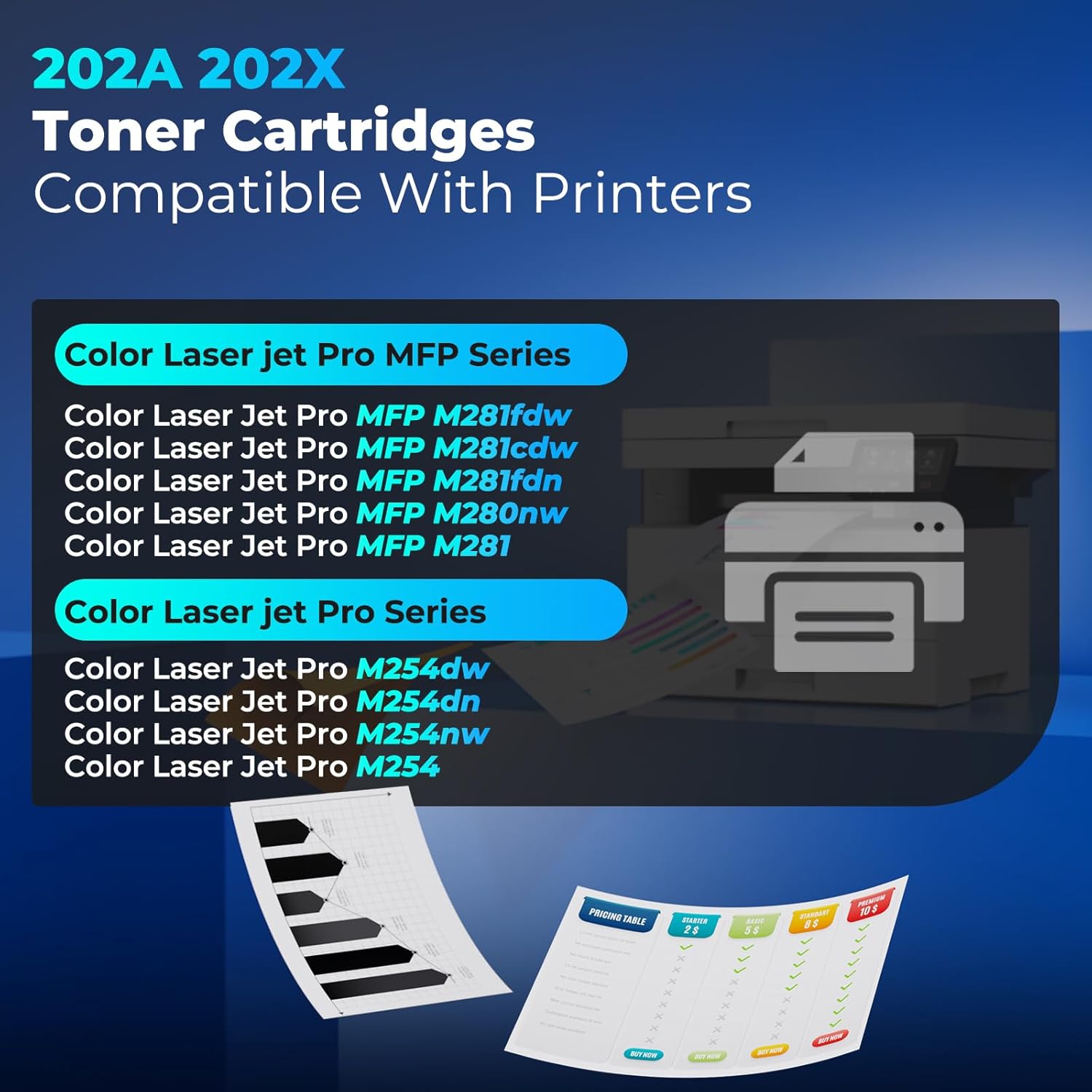 - 202A Toner cartridges Feature: Toner 202A compatible for hp 202A toner cartridges Combo Pack for Color Laser jet Pro MFP M281FDW toner cartridges, Color Laser jet Pro MFP M281CDW toner cartridges, Color Laser jet Pro MFP M281FDN toner cartridges, Color Laser jet Pro MFP M280NW toner cartridges, Color Laser jet Pro MFP M281 toner cartridges, Color Laser jet Pro M254DW toner cartridges, Color Laser jet Pro M254DN toner cartridges, Color Laser jet Pro M254NW, M254 toner cartridges
