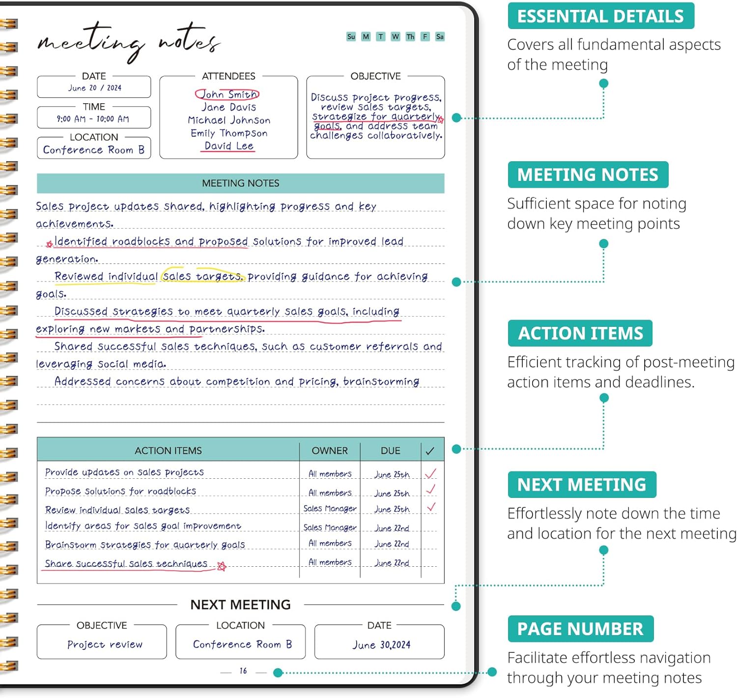 - Boost Meeting Efficiency: A meeting notebook helps you manage and streamline meeting details, ensuring discussions, decisions, and action items are accurately captured and organized. It promotes a more efficient workflow, allowing for easy reference and retrieval of information during and after the meeting.