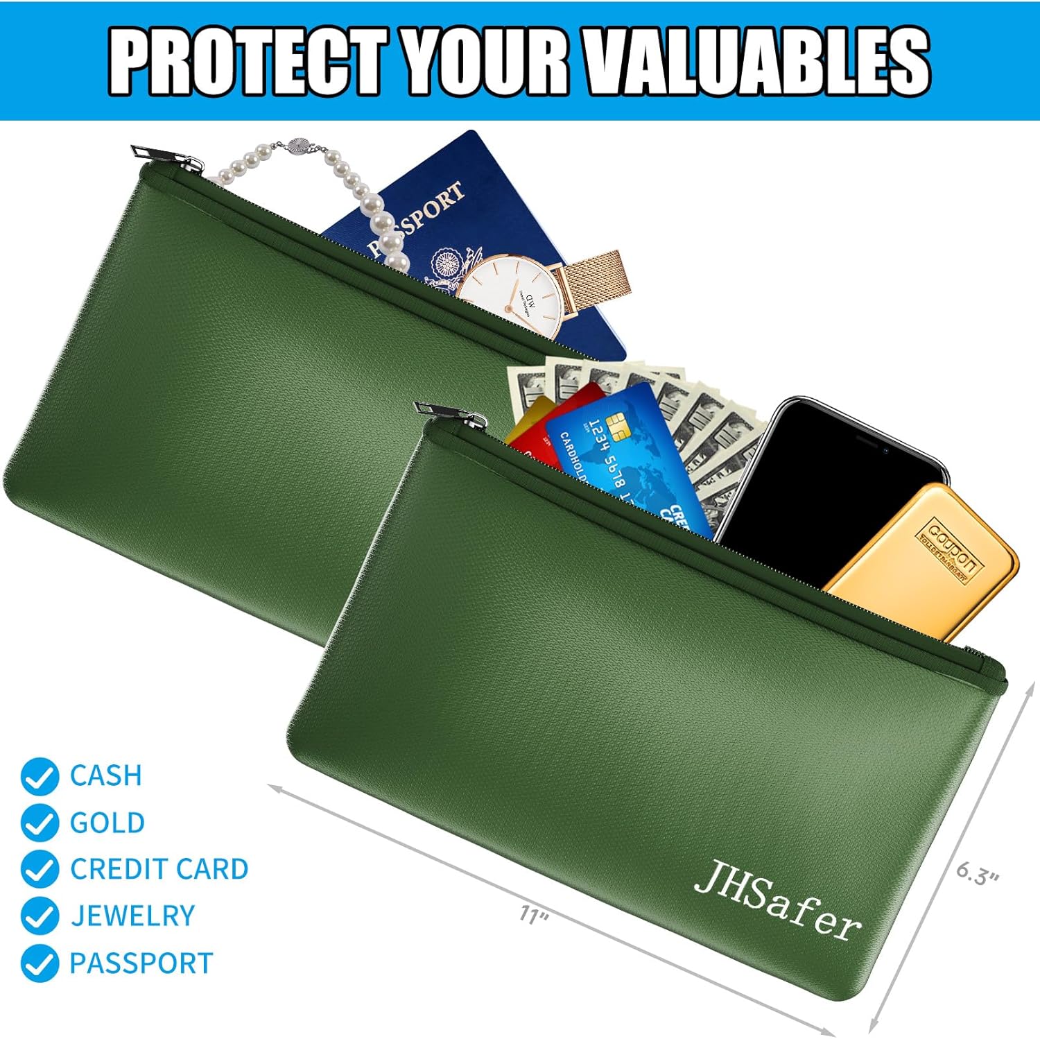 6400℉ Fireproof and Waterproof Money Bags 2pcs with Zipper,11''x6.3'' Fireproof Cash Bag with Zipper,Fireproof Wallet Envelope Safe Pouch Fireproof Bags for Cash Passports Keys Jewellery (Green)