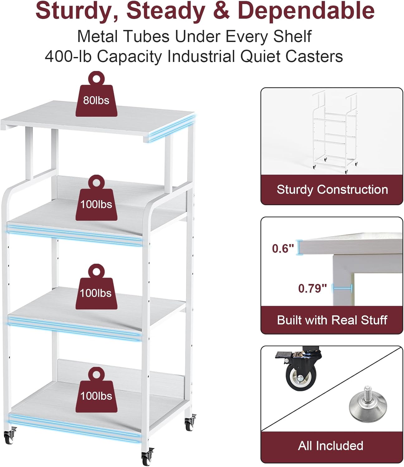 4 Tier White Printer Stand with Storage Shelf, Large Tall Printer Table for Home Office, Rolling Printer Cart with Industrial Wheels for Paper Shredder Scanner Fax Heat Press Small Space (White)