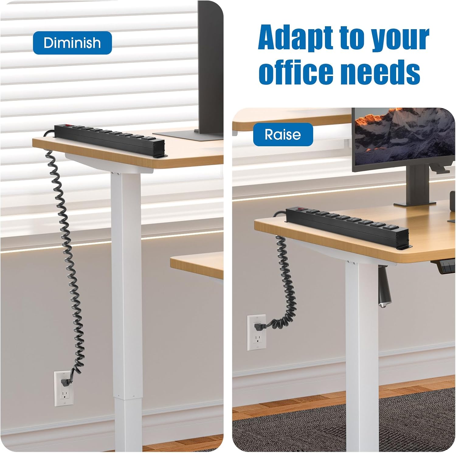 - Spring Cord Power Strip: Equipped with a 4 foot spring-loaded cord to keep things neat and organized while extending the length of the power cord, perfect for height-adjustable standing desks and your other needs.