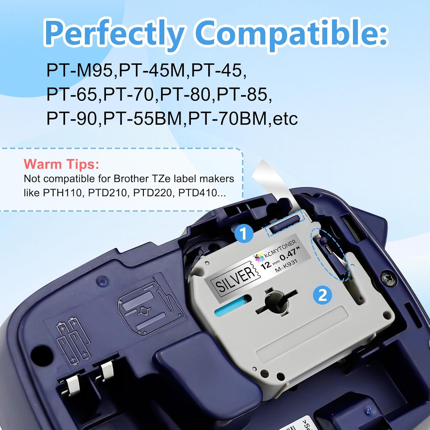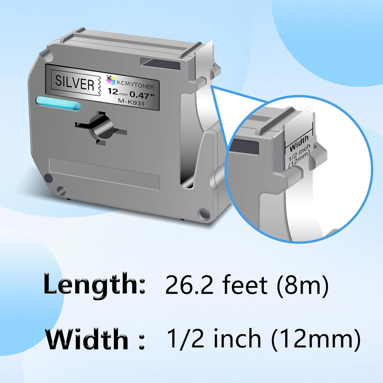 - Package Include: 3 pack KCMYTONER compatible for ptouch M-K931 M931 MK931 M-931 M-K931S non-laminated label maker tape; color: black print on sliver tape; size: 12mm (1/2 inch) x 8m (26.2 feet).