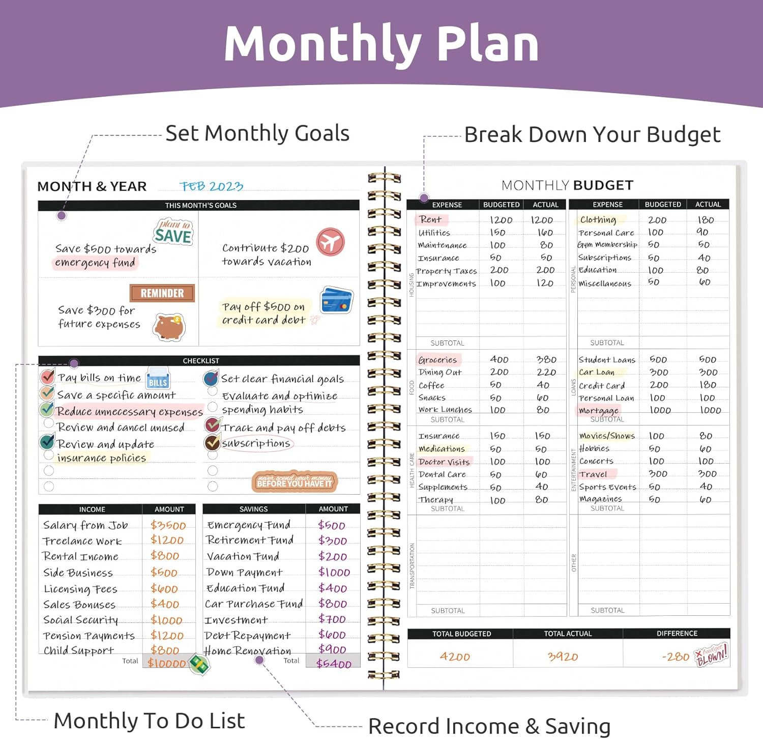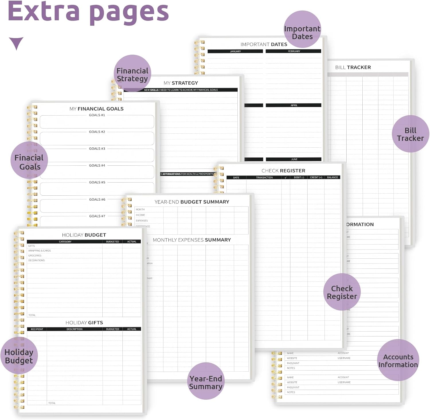 - Full-Page Calendars & Bonus Stickers - Featuring full-page calendars each month, you'll have ample space to mark paydays, bills due, appointments, and important dates. Say goodbye to cramped boxes and difficult writing spaces. Plus, we've included 3 cute sticker sheets that allow you to personalize your financial organizer and make budgeting more fun.