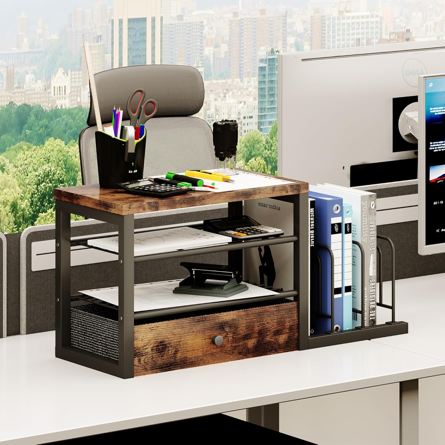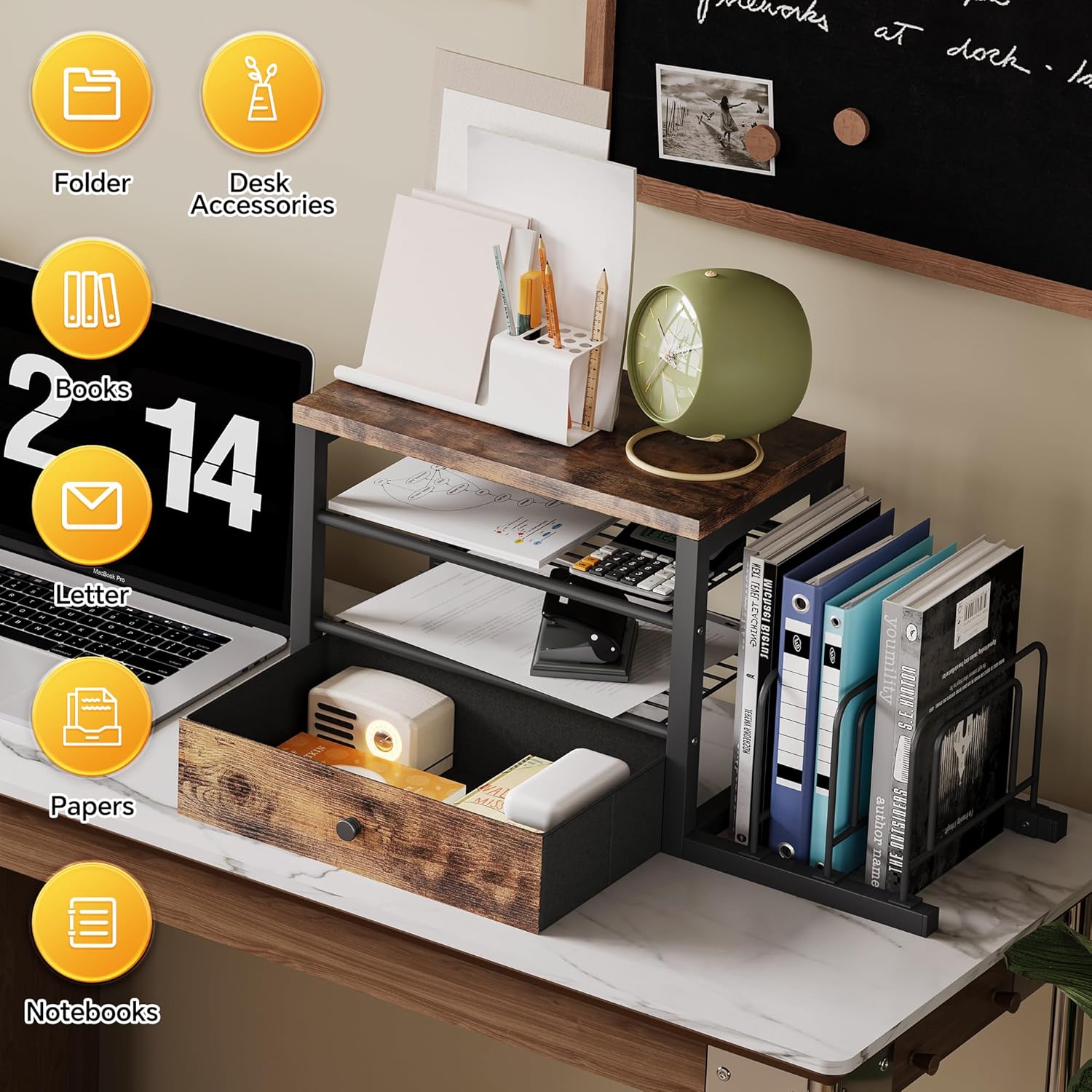 - β ALL-IN-ONE DESK ORGANIZATION β Features compartments for books, notebooks & supplies + drawer (fits pens, clips, tools) & vertical file holder for folders/mail.