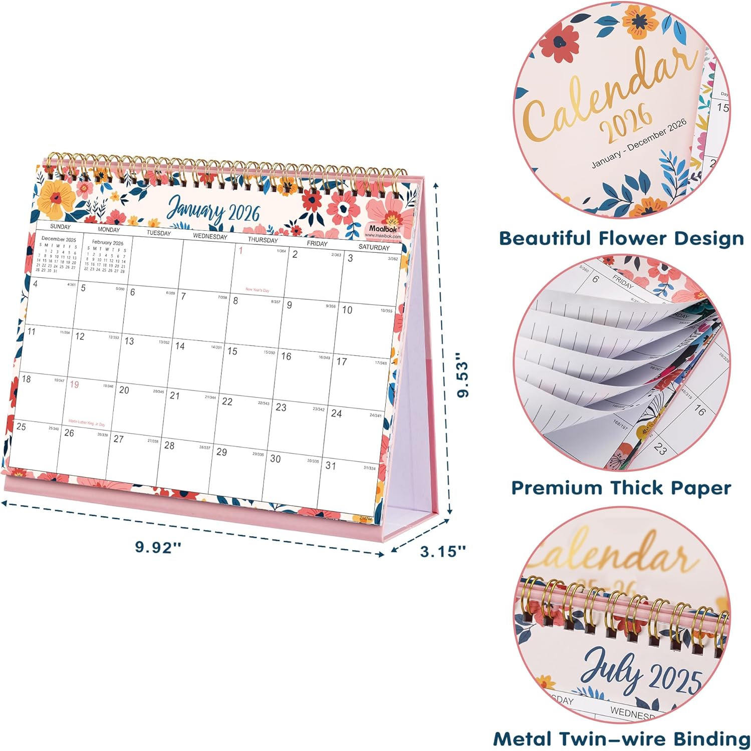 - ๐ผ PREMIUM PAPER - This desktop calendar 2026 uses premium and thick paper, can well avoid seepage and ink feathering, and give you a better writing experience. More, the metal strong Twin-Wire Binding can help you to flip this stand up calendar easily.