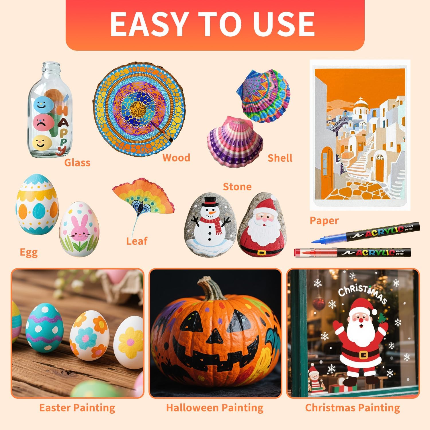 - 72 Colors Acrylic Paint Pens: The paint markers are perfect for a variety of surfaces, including ceramic, fabric, paper, rock, wood, glass, canvas, and more. Whether you're working on a DIY home improvement project or painting, these wood paint markers deliver bright, bold colors on every surface to get your imagination running wild