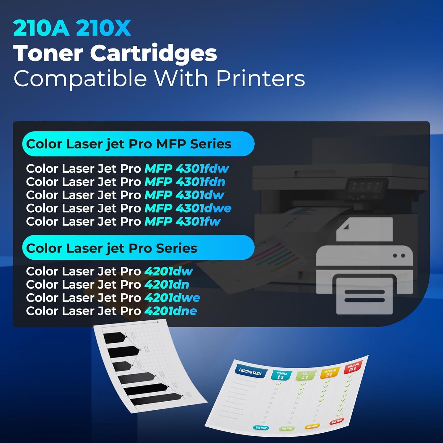 - 210A Toner cartridges Feature: Toner 210A compatible for hp 210A 210X toner cartridges Black Color Combo Pack compatible for Color Laser Jet Pro MFP 4301fdw Toner, MFP 4301fdn Toner, MFP 4301dw Toner, MFP 4301dwe Toner, MFP 4301fw Toner cartridges, compatible for Color Laser Jet Pro 4201dw Toner, 4201dn Toner, 4201dwe Toner, 4201dne Toner cartridges